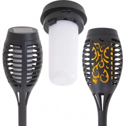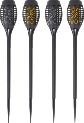 Skab en magisk stemning i haven med et sæt på fire solardrevne fakellamper. Hver lampe har 12 LED, som skaber en flakkende flammeeffekt og tænder automatisk efter mørkets frembrud. Solcelledrift uden kabler, nem nedstikning i jorden og varmt, dekorativt lys til stier, bede og pergolaer.