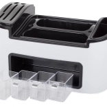 Multifunktionel køkkenorganisator til opbevaring af bestik, krydderier og køkkenredskaber, som hjælper med at holde overblik og effektivitet i det daglige køkkenarbejde.