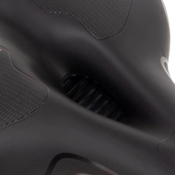 Der ergonomisch geformte TRIZAND-Sattel kombiniert Komfort und Langlebigkeit für Stadtfahrten und längere Touren. Dank weichem Schaum und zwei Stahlfedern absorbiert er Vibrationen effektiv, was Ermüdung verringert und den Komfort auch auf längeren Strecken erhöht. Der zentrale Belüftungskanal verbessert die Luftzirkulation und reduziert Feuchtigkeitsansammlungen.