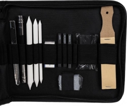 Enthalten sind außerdem Blender (Papier-Tortillons) in drei Durchmessern, ein Schneidemesser, Doppel- und klassischer Spitzer, ein knetbarer Radiergummi sowie ein klassischer Radiergummi und ein Set Schleifpapiere für die perfekte Spitzenform. Das Set eignet sich hervorragend für Porträts, technische Zeichnungen und künstlerische Skizzen.