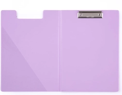 Verschließbare Schreibunterlage in modernem lila mit Metallclip und innenliegender transparenter Tasche, ideal zur Organisation Ihrer Dokumente.