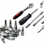 Das 1/4" Steckschlüssel-Set enthält eine breite Auswahl an Stecknüssen, Schraubendrehereinsätzen und Zubehör für verschiedene mechanische Arbeiten. Die Schlüssel sind aus hochwertigem Chrom-Vanadium-Stahl gefertigt, was ihre Haltbarkeit und lange Lebensdauer garantiert. Der präzise Ratschenmechanismus mit 45 Zähnen ermöglicht einen reibungslosen Lauf und einfache Handhabung in engen Räumen.