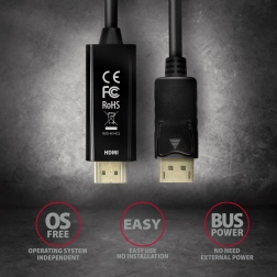 Der aktive DisplayPort-zu-HDMI-Adapter der Marke AXAGON ist die ideale Lösung, um Ihr Gerät mit einem HDMI-Monitor oder Projektor zu verbinden. Dieses kompakte Kabel gewährleistet die Übertragung von Bild und Ton ohne die Notwendigkeit zusätzlicher Installation oder Einstellung. Sein unidirektionales Design unterstützt die Kommunikation von DisplayPort zu HDMI.