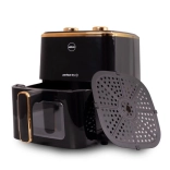 Zwei Bedienknöpfe für Temperatur und Zeit, herausnehmbarer Korb und Gitter mit Antihaftbeschichtung für eine einfache Reinigung ohne Geruchsaufnahme.