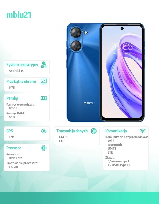 Die Hauptkamera mit 13 MP und einem Fünflinsenobjektiv fängt jedes Detail ein, während die 8 MP-Frontkamera Ihr Partner für Selfies und Videoanrufe ist. Das MEIZU ist mit dem neuesten Betriebssystem Android 14 und umfangreichen Konnektivitätsoptionen ausgestattet, darunter Wi-Fi, Bluetooth 5.0 und USB Type-C.