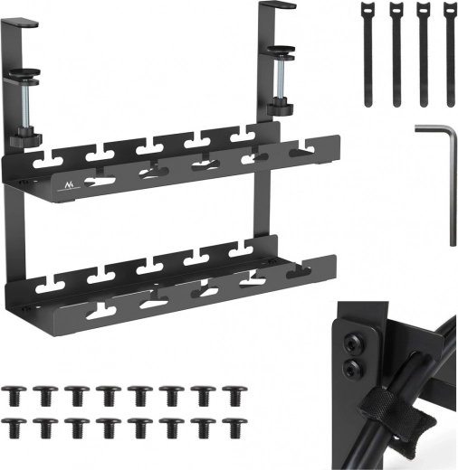 Behalten Sie Ordnung unter dem Tisch mit dem zweistufigen Organizer, der bis zu zwei Steckdosenleisten oder eine Kombination aus Netzteilen, Netzwerkgeräten und Zubehör aufnimmt. Die Länge von 40 cm bietet ausreichend Platz auch für umfangreiche Verkabelungen, während Schlitze und Durchführungen das Verlegen und Bündeln erleichtern.