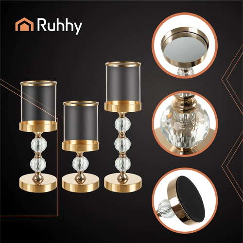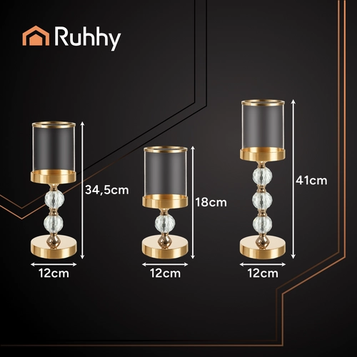 Schaffen Sie zu Hause eine gemütliche Atmosphäre mit dem Designer-Set der RUHHY-Kerzenhalter. Drei unterschiedliche Höhen wirken harmonisch und verleihen dem Raum mehr Tiefe. Spiegelelemente und kristallene Akzente unterstreichen den eleganten Glamour-Stil, während das goldene Finish dem Interieur einen raffinierten Glanz verleiht. Das Set ist universell einsetzbar – perfekt für Wohnzimmer, Schlafzimmer, Esszimmer und Bad.