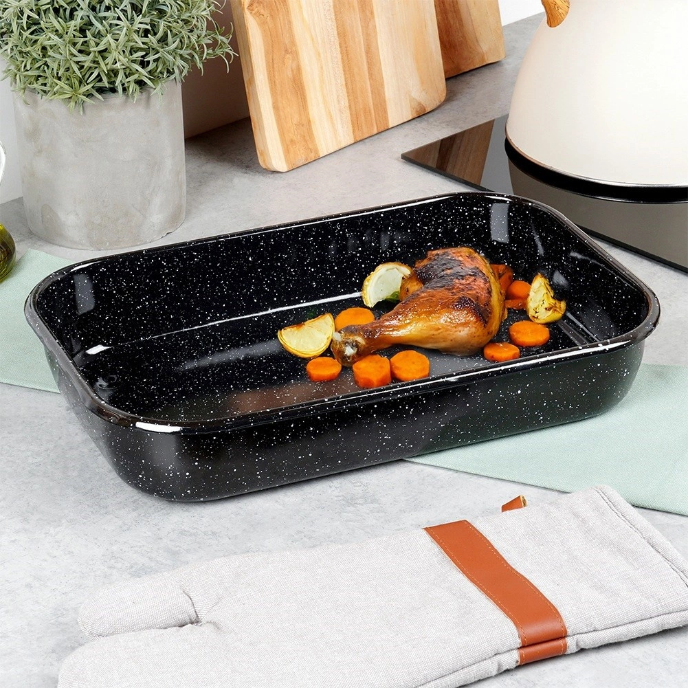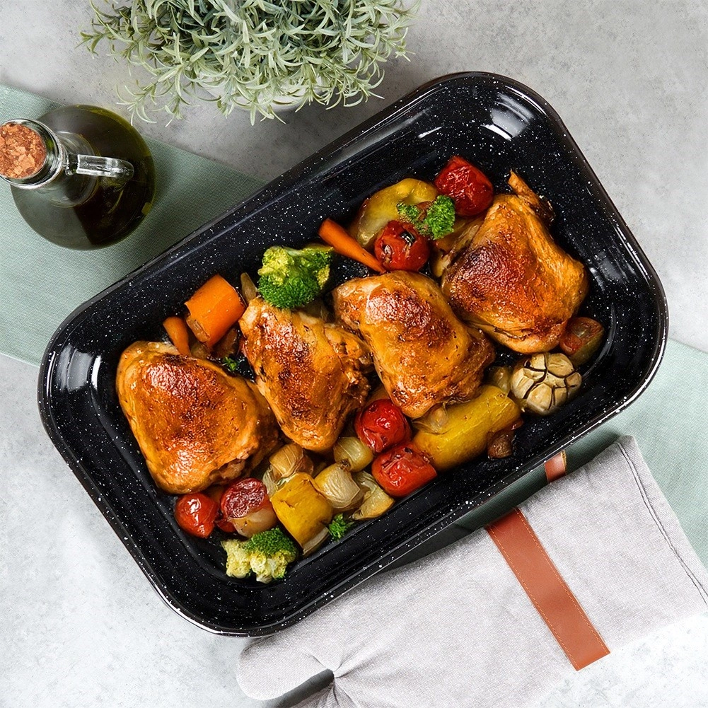 Der rechteckige Bräter aus emailliertem Stahl ist robust, hygienisch und leitet Wärme hervorragend für ein gleichmäßiges Garen. Emaille ist gesundheitsschonend und auch für Allergiker geeignet. Dank der universellen Maße 38 × 24,5 × 7 cm (innen 36 × 22,5 × 6 cm) eignet er sich zum Braten von Fleisch, Gemüse, Aufläufen und Desserts.