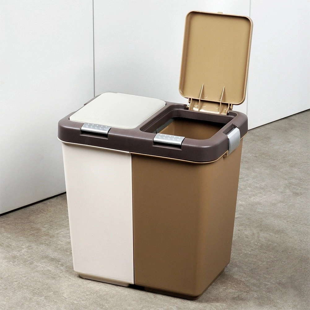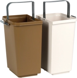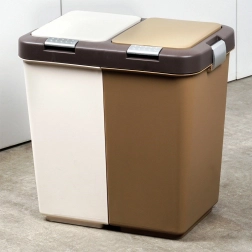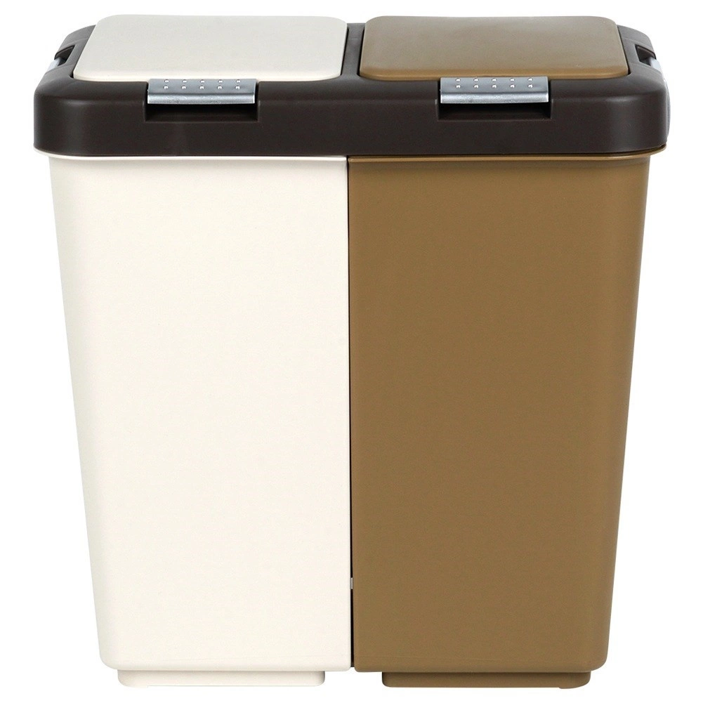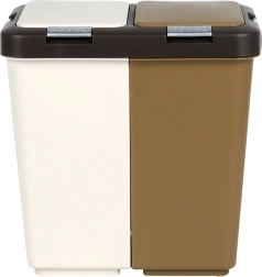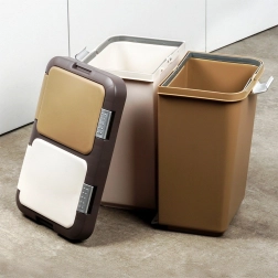 Der Eimer besteht aus robustem Kunststoff in Weiß-Braun und fügt sich in moderne wie auch kleinere Räume ein. Kompakte Abmessungen sparen mehr Platz als zwei separate Eimer und verhindern dank verschließbarer Deckel gleichzeitig die Ausbreitung von Gerüchen.
