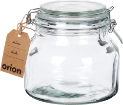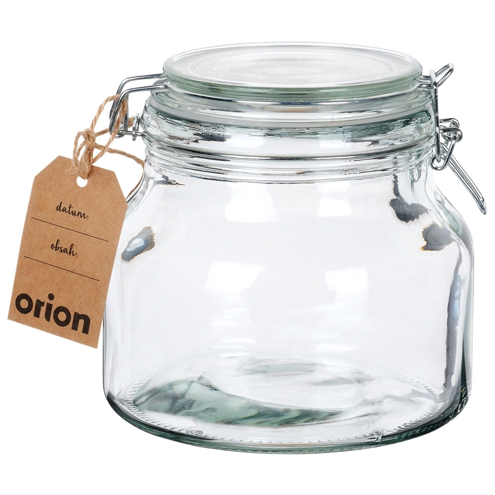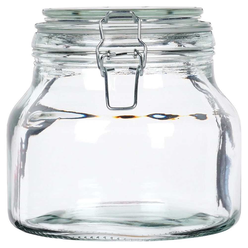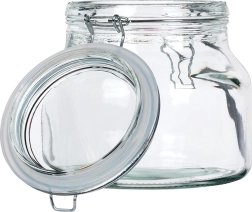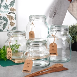 Starkes Glas mit weiter Öffnung lässt sich leicht befüllen und reinigen und ist geeignet zur Aufbewahrung von Trockenwaren und Eingekochtem.
