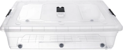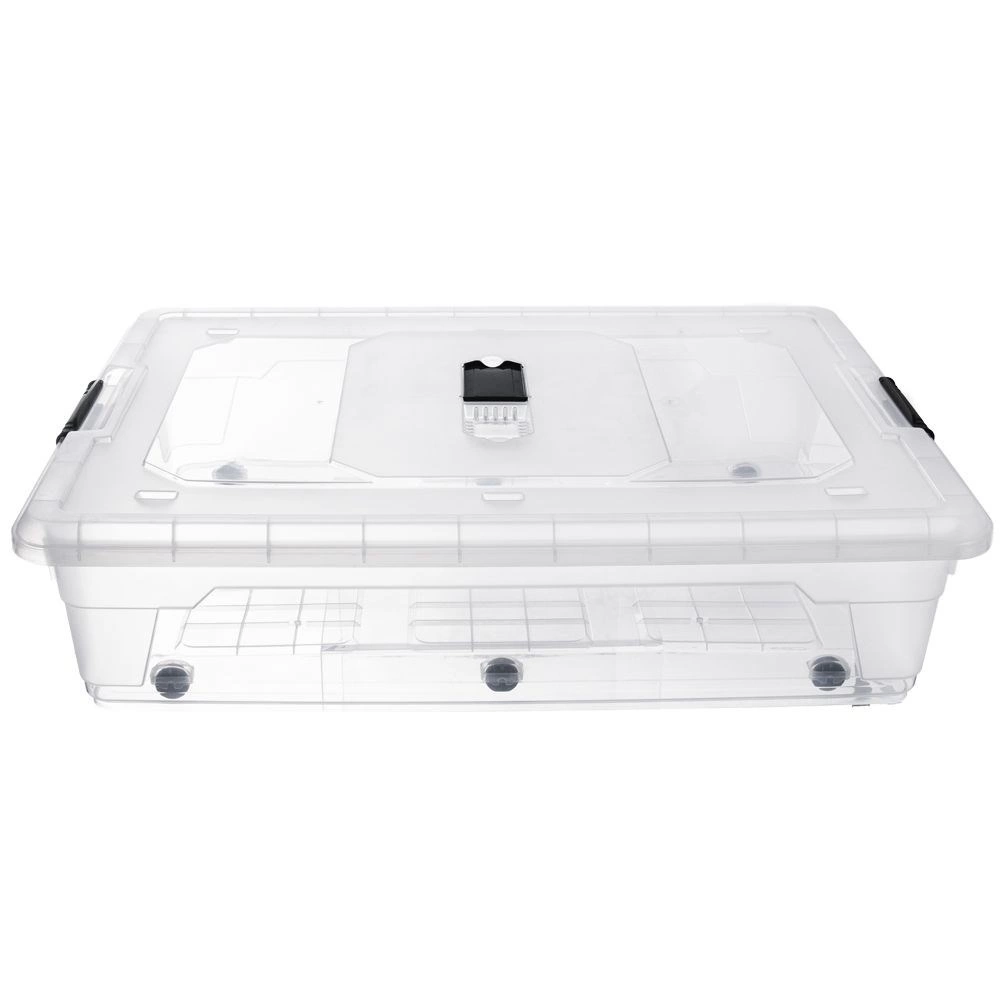 Praktische Unterbettbox mit 50 l Volumen, die Ihr Zuhause ordentlich und übersichtlich hält. Dank des transparenten Kunststoffs sehen Sie den Inhalt auf einen Blick, robuste Clips sorgen für ein sicheres Verschließen und die integrierte Belüftungsöffnung hilft, die Dinge frisch zu halten. Das niedrige Profil mit Rollen für leichtes Herausziehen ist ideal für kleine Wohnungen und Schlafzimmer.
