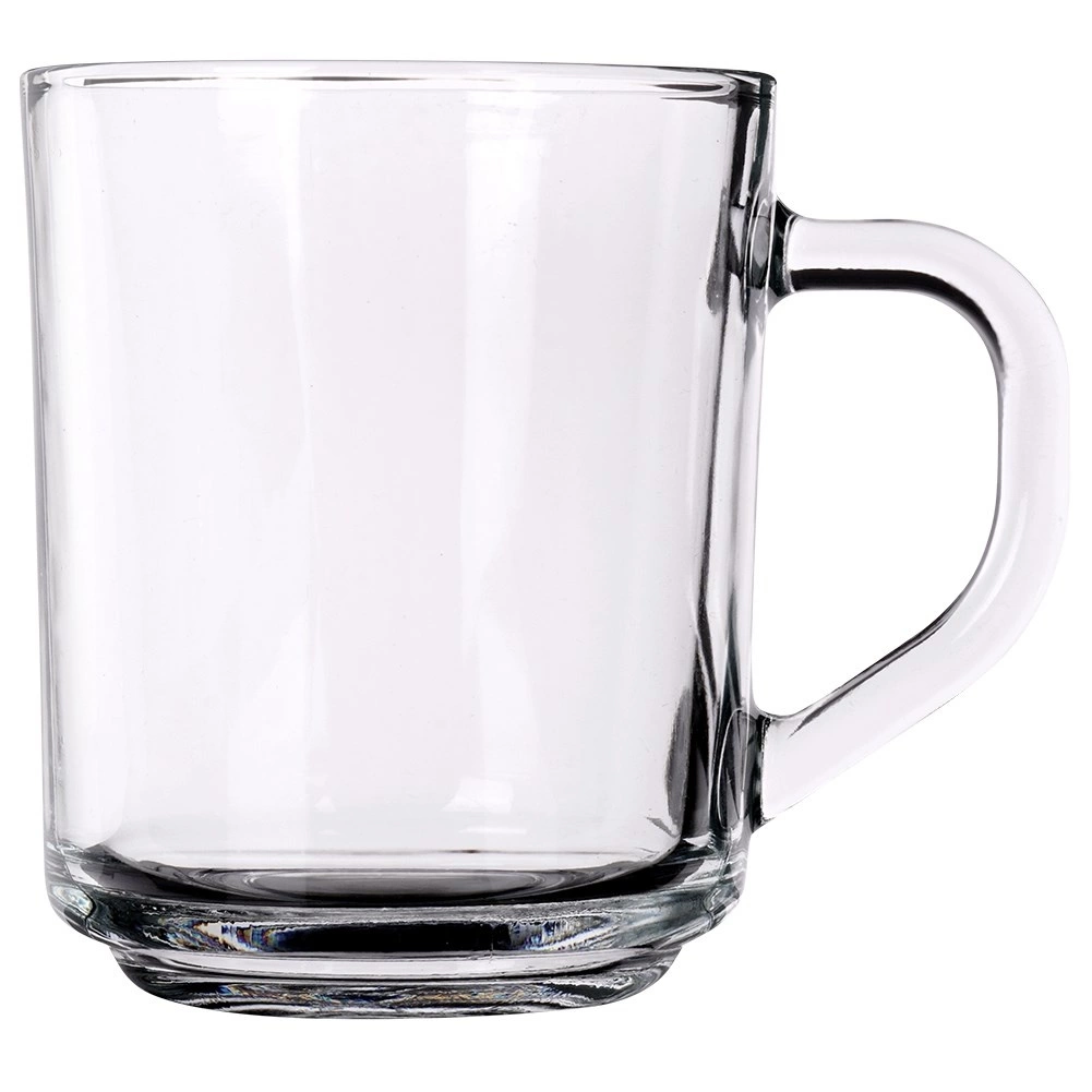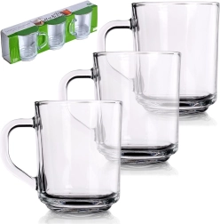 Elegante Glasbecher mit festem Henkel sind ideal zum Servieren von Kaffee, Tee, Wasser, Saft und anderen Getränken. Das transparente Glas betont die Farbe des Getränks und dank der klassischen zylindrischen Form liegen die Becher gut in der Hand und sind angenehm zu trinken.