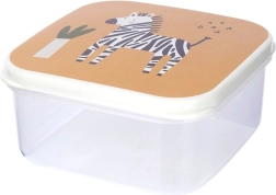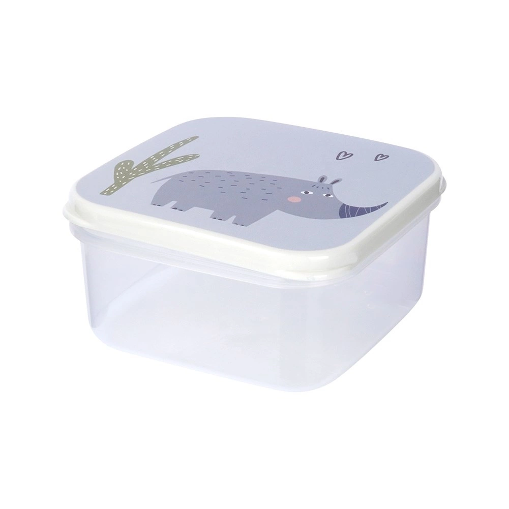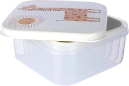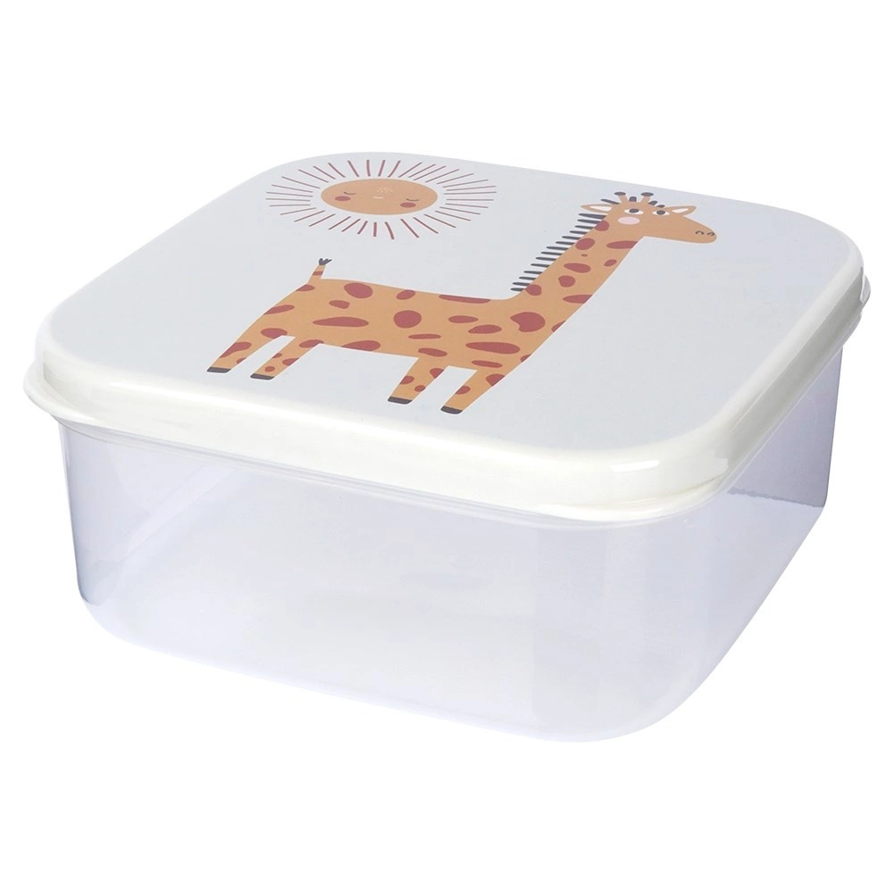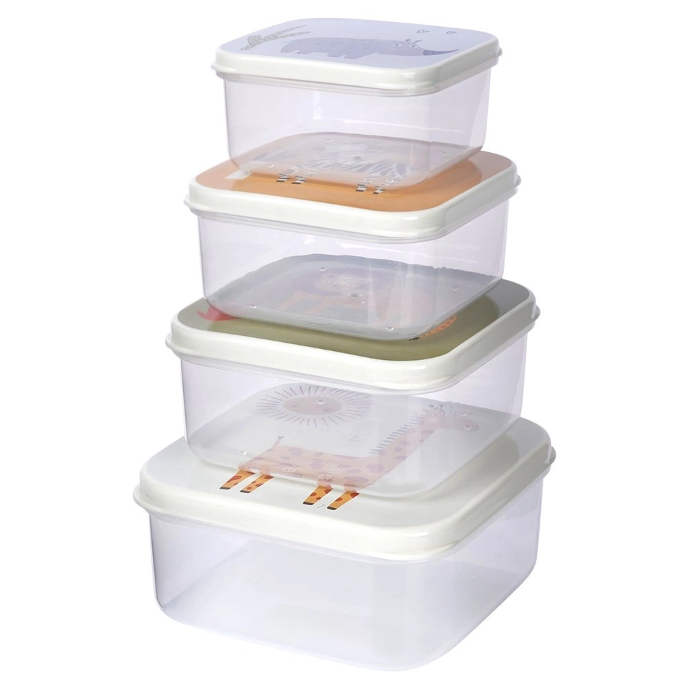 Praktisches Set aus vier quadratischen Dosen für Kinder-Snacks und -Mittagessen mit lustigen Motiven von Giraffe, Löwe, Zebra und Nashorn. Die Dosen sind leicht, robust, BPA-frei und halten dank dicht schließender Deckel die Lebensmittel frisch und sicher verschlossen. Ideal für die Schule, Ausflüge und die übersichtliche Aufbewahrung im Kühlschrank.