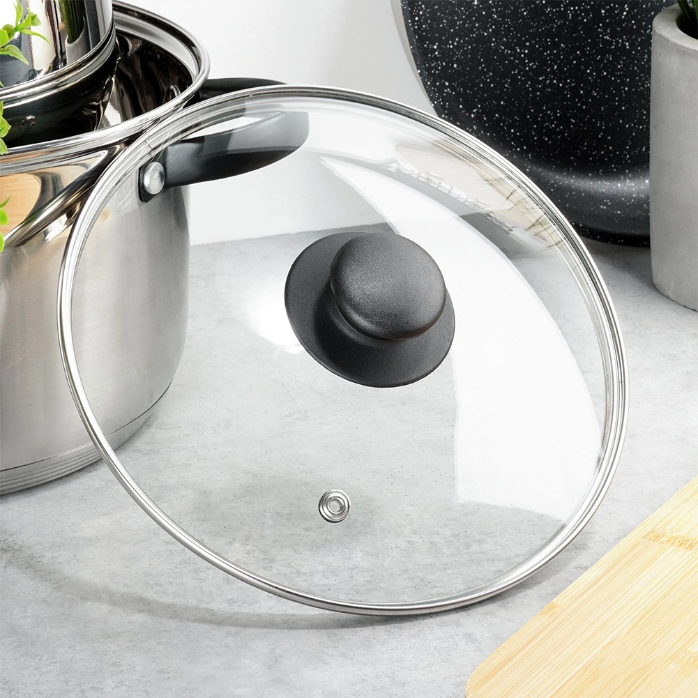 Der Edelstahlrand erhöht die Widerstandsfähigkeit und Dichtheit, während der hitzebeständige Kunststoffknopf einen sicheren und komfortablen Halt gewährleistet.