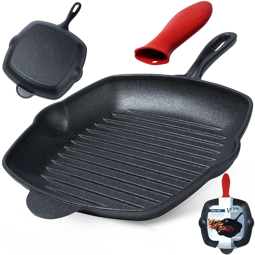 Quadratische Gusseisen-Grillpfanne mit den Maßen 28 × 28 cm, praktischen Ausgießern und rotem Silikonüberzug am Griff. Bietet eine schnelle und gleichmäßige Wärmeverteilung, tiefe Grillrillen für markante Brandstreifen und hohe Hitzebeständigkeit für den Einsatz auf dem Herd, Grill und im Ofen. Ideal für Fleisch, Gemüse und Kartoffeln und langes Servieren dank hervorragender Wärmespeicherung.