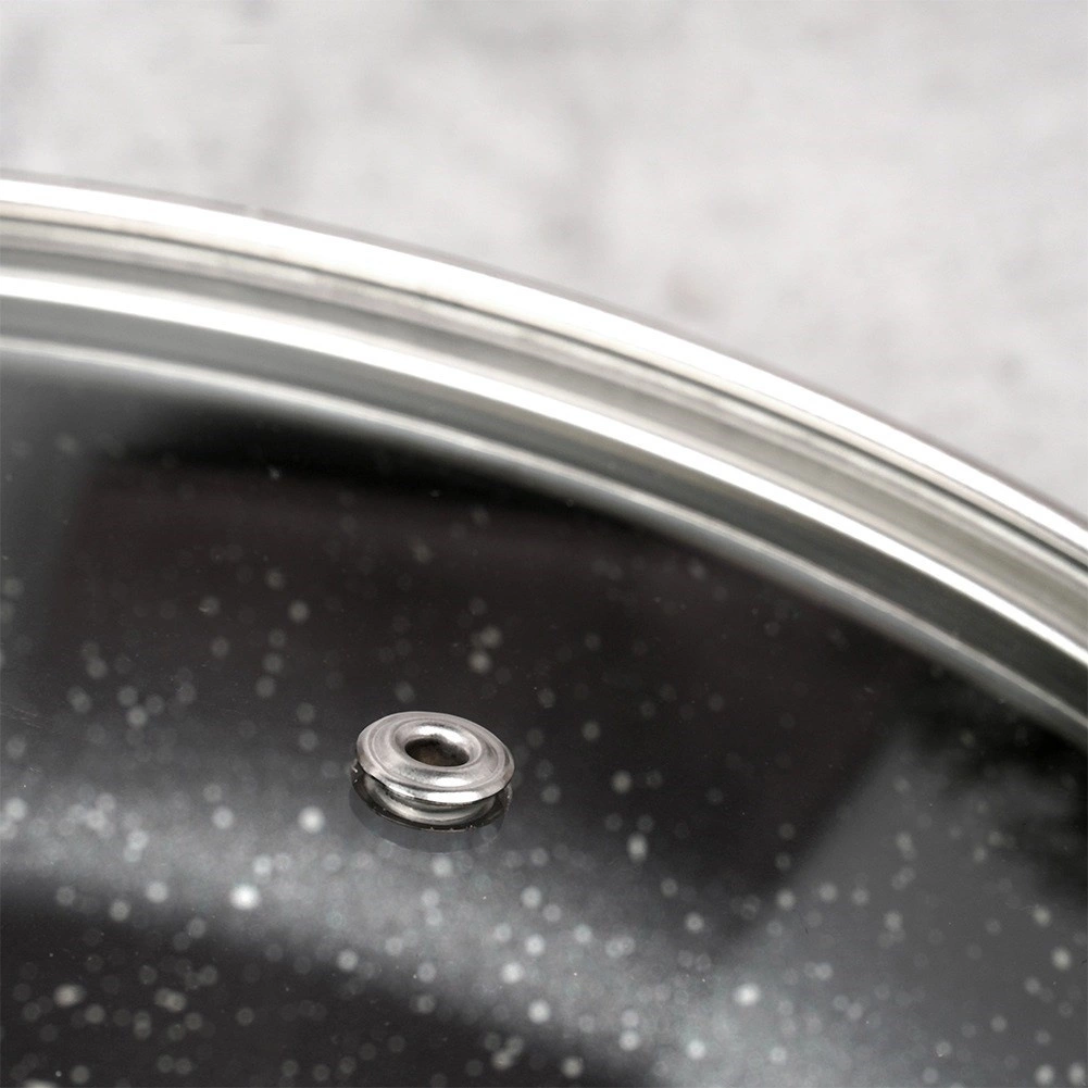 Die robuste Edelstahlumrandung gewährleistet Langlebigkeit und einen dichten Sitz am Rand des Kochgeschirrs. Der ergonomische Knauf in Holzoptik fühlt sich angenehm an und ist sicher in der Handhabung. Die integrierte Entlüftungsöffnung führt überschüssigen Dampf zuverlässig ab, und die leicht gewölbte Form fördert die Zirkulation heißer Luft.