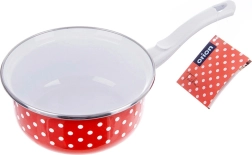 Elegante Stielkasserolle im Retro-Design mit roter Emaille und weißen Punkten, ein Schmuckstück für Ihre Küche und zugleich jeden Tag praktisch im Einsatz. Dank des langen Griffs liegt sie bequem in der Hand und ermöglicht einfaches Ausgießen. Die Emaille ist gesundheitsverträglich und auch für Allergiker geeignet.