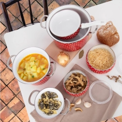Der Korpus aus hochwertigem emailliertem Stahl mit Edelstahlrand ist widerstandsfähig für den täglichen Gebrauch und auch für Allergiker unbedenklich. Die Oberfläche lässt sich leicht reinigen und ist spülmaschinengeeignet.