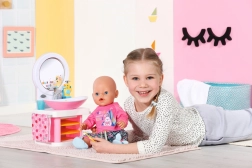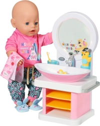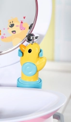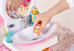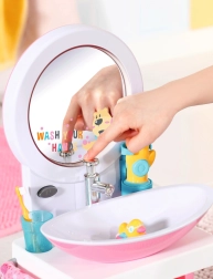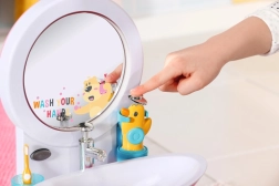 Bringen Sie Kindern spielerisch richtige Hygieneroutinen bei. Das weiß-rosa BABY born Puppenwaschbecken bietet Licht- und Soundeffekte, einen realistischen Wasserstrahl beim Drücken des Hahns sowie niedliche Accessoires für umfassende Pflege. Sobald der Spiegel aufleuchtet, erklingt eine Melodie, die als spielerischer Timer fürs Händewaschen dient.