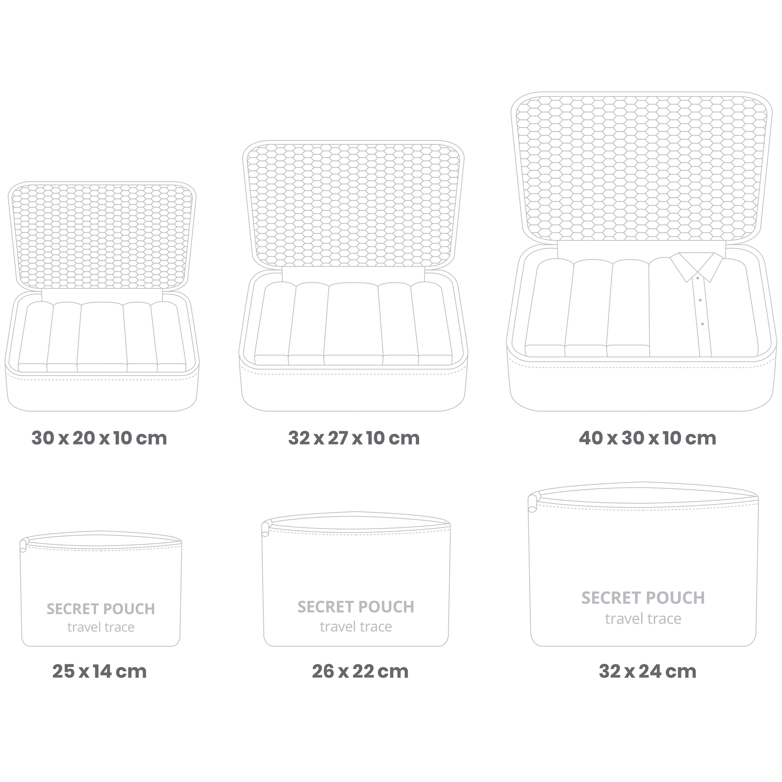 Das Set umfasst drei geräumige Kuben mit atmungsaktiver Netzoberseite und drei flache Taschen mit der Aufschrift „Laundry Pouch“ für Schmutzwäsche. Leichtes Textilgewebe und strapazierfähige Reißverschlüsse sorgen für komfortables Packen, Übersicht und Schutz Ihrer Sachen während der Reise.