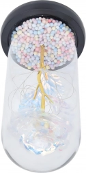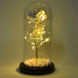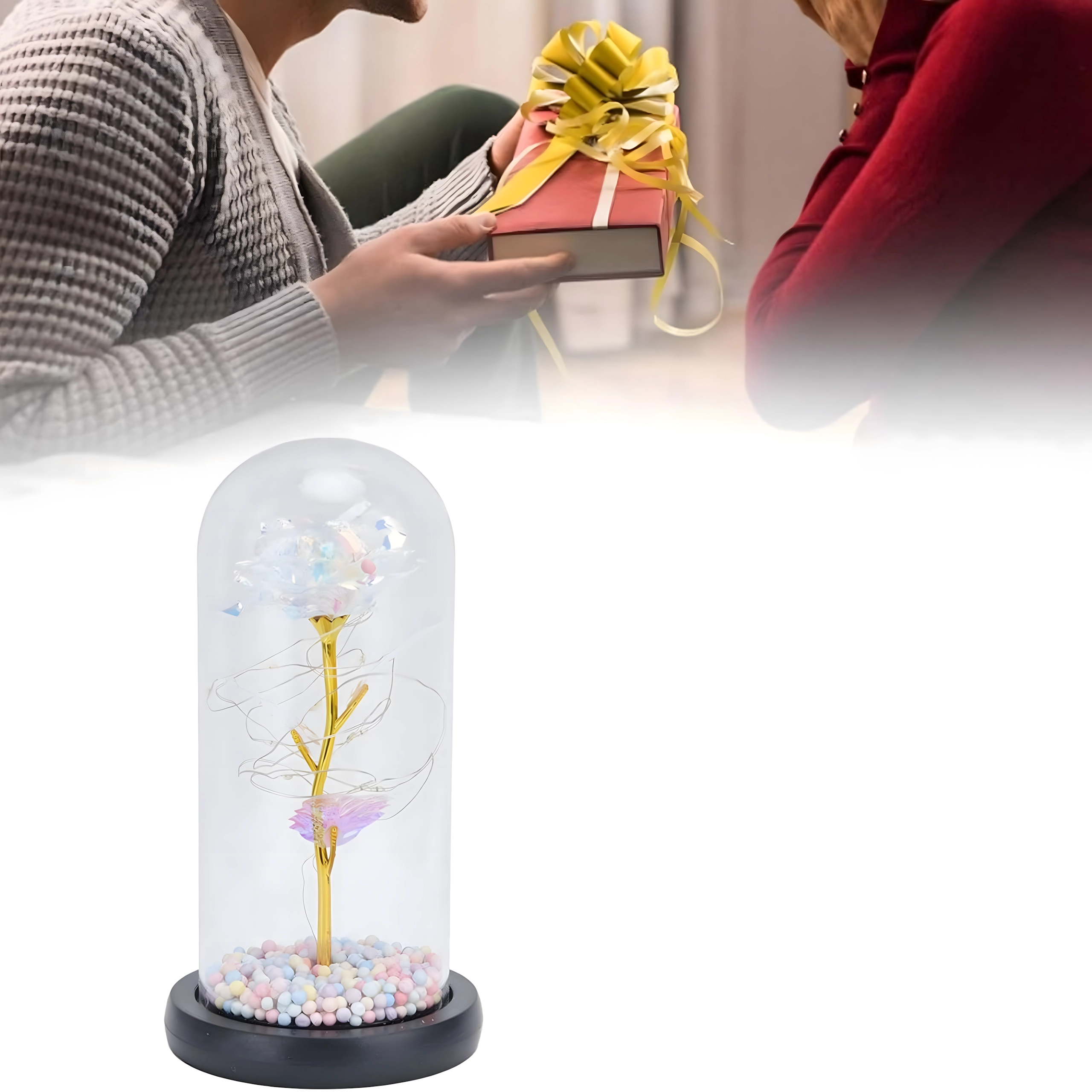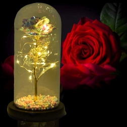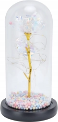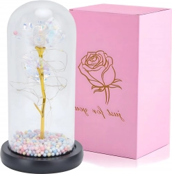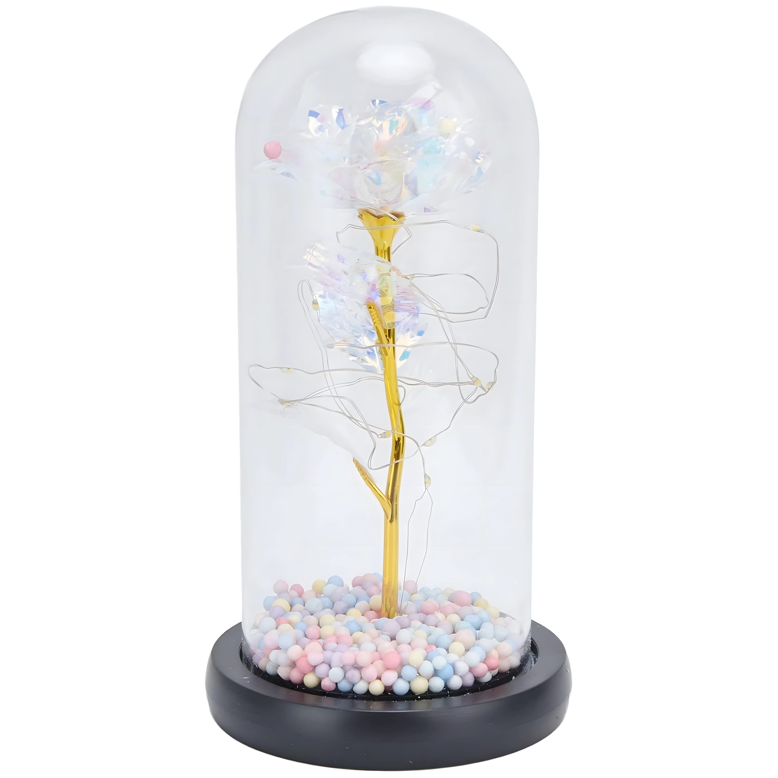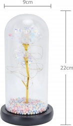 Diese weiße ewige Rose unter der Kuppel ist ein Symbol zeitloser Liebe und geschmackvollen Designs. Die Glasabdeckung schützt die feinen Details der Blüte, während zarte LED-Drähte den goldenen Stiel umschlingen und warmes Ambientelicht erzeugen. Pastellfarbene Perlen im Sockel verleihen der Dekoration einen verspielten Akzent.