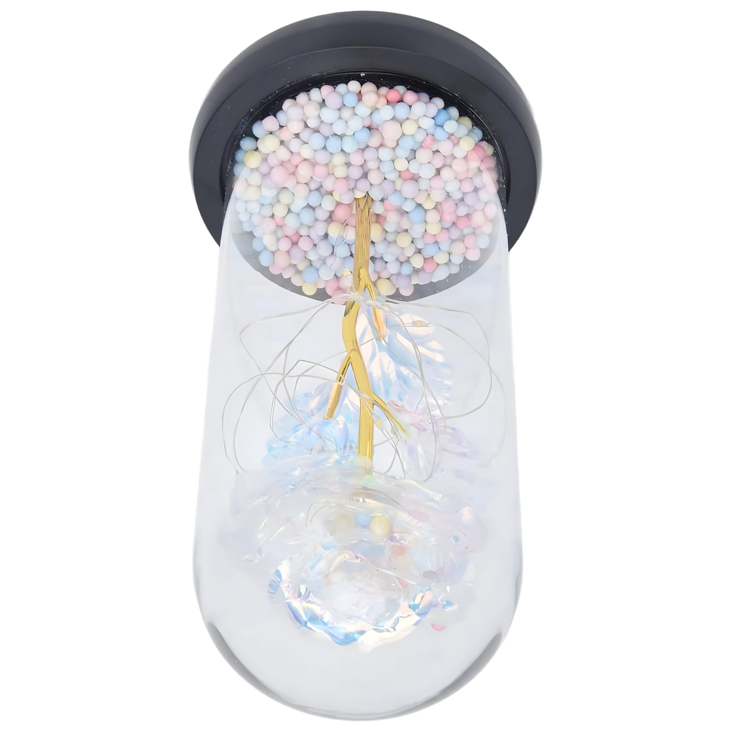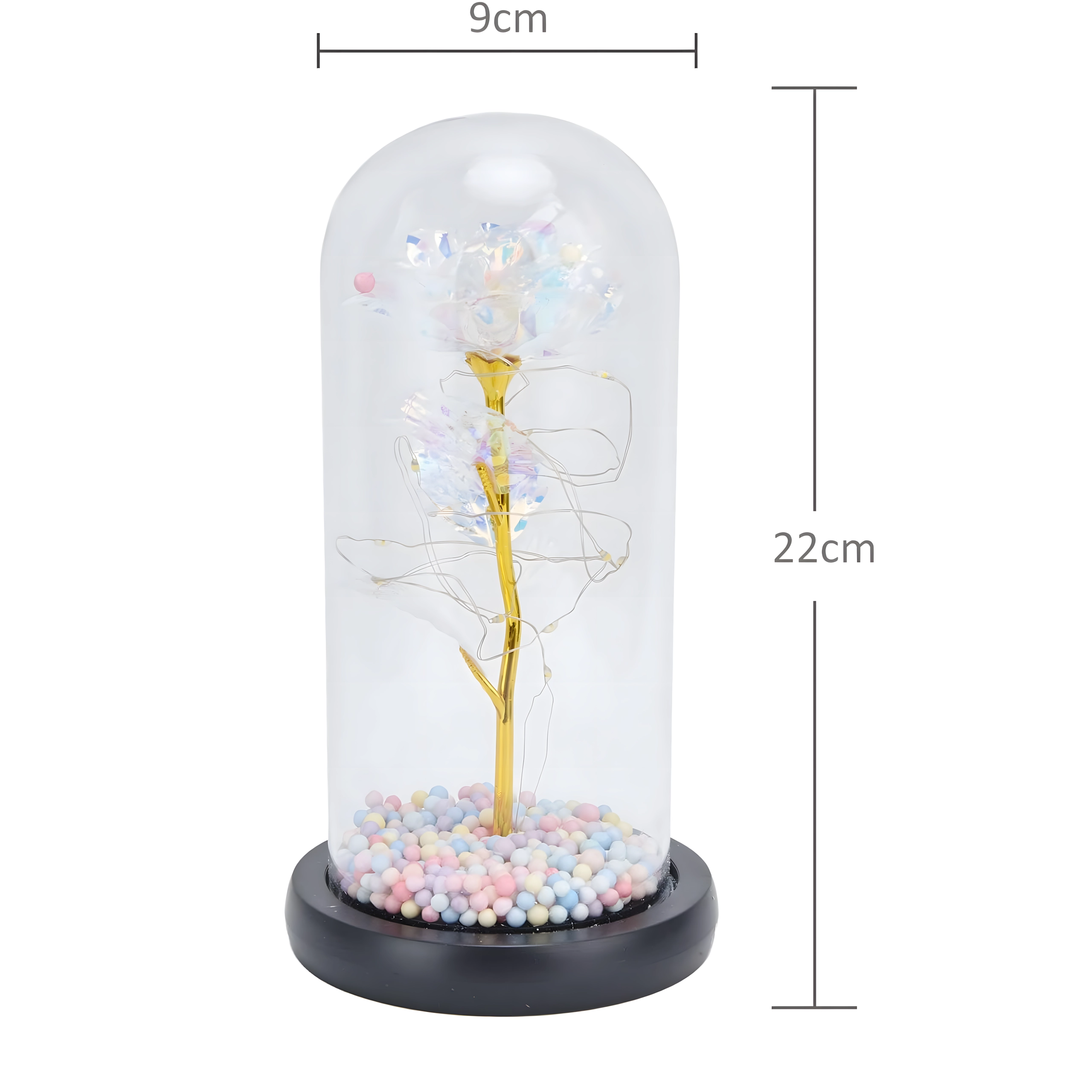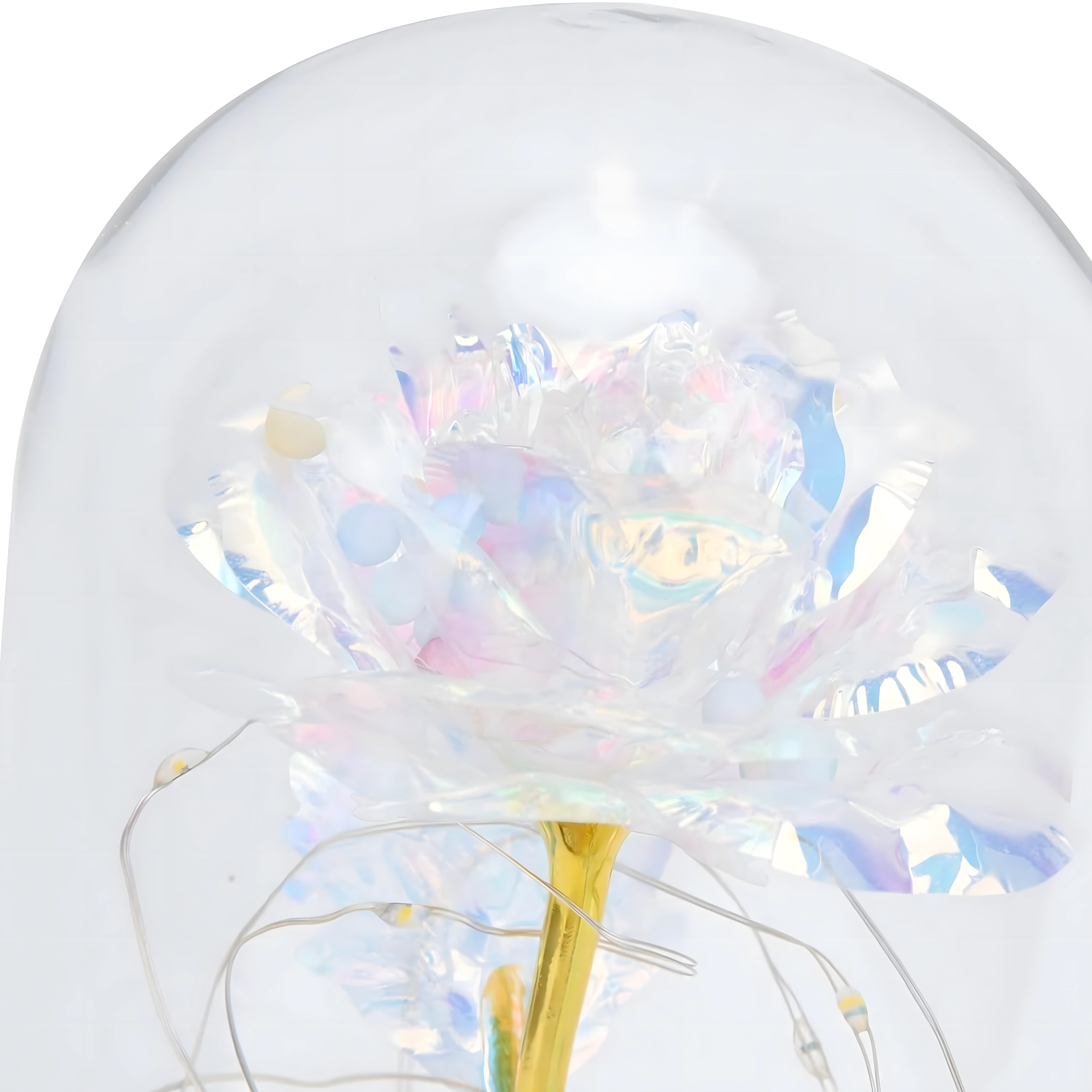 Die klare Glasabdeckung schützt die Blüte vor Staub und betont ihre funkelnden, irisierenden Blätter – die Dekoration strahlt aus jedem Blickwinkel.