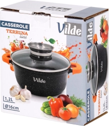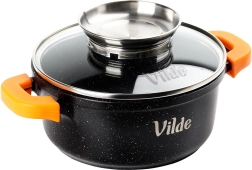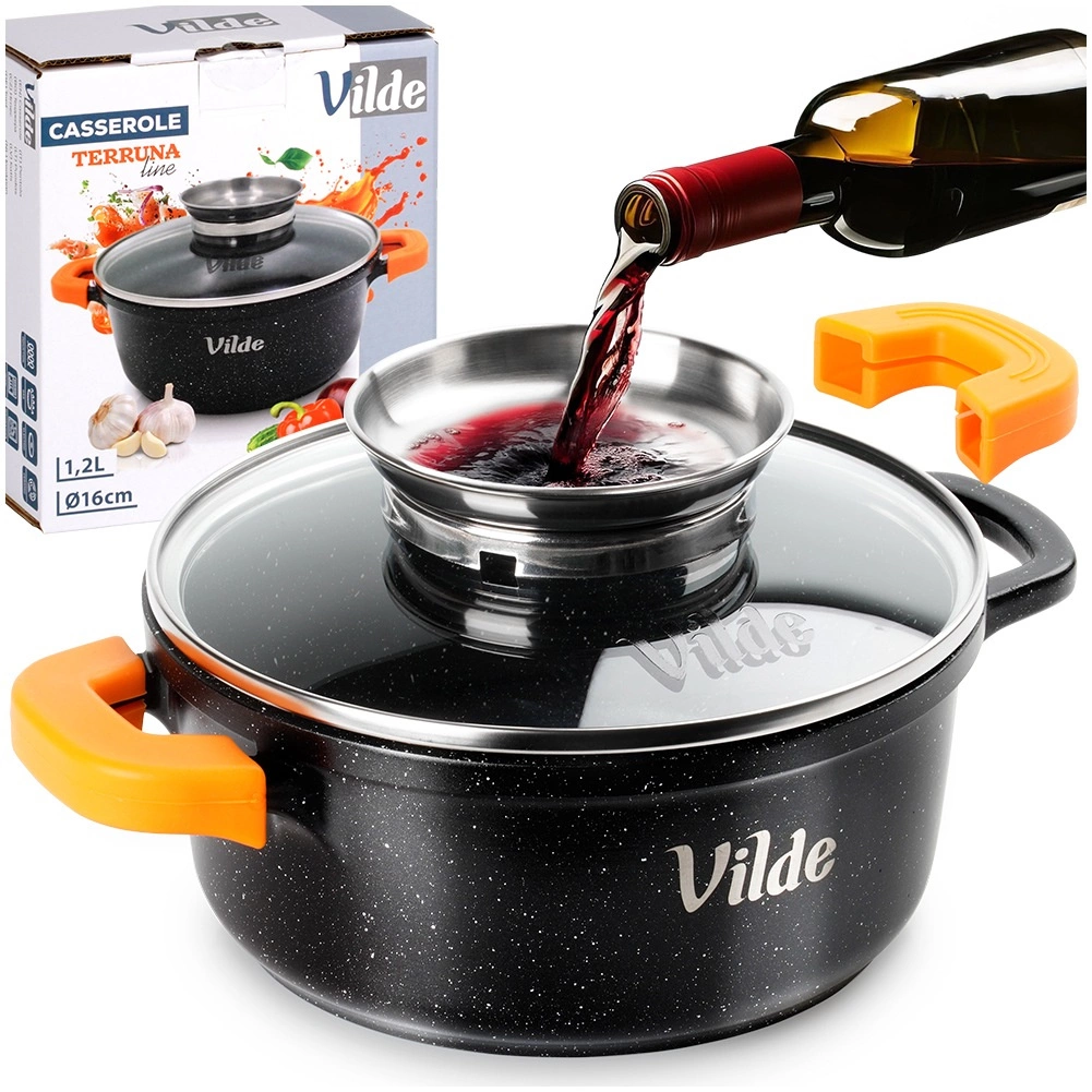Vielseitiger Topf aus gegossenem Aluminium mit granitierter Antihaftbeschichtung – ideal für den täglichen Einsatz: von Suppen, Saucen und Schmorgerichten bis zum Überbacken. Der Glasdeckel mit Edelstahlgriff dient zugleich als Dosierer für flüssige Würzzutaten, sodass Sie ohne Anheben nachgießen und Temperatur sowie Aroma im Topf halten können.
