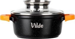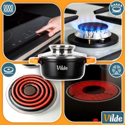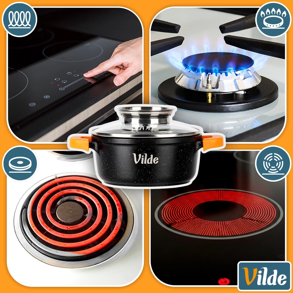 Der mehrschichtige Boden mit Induktionsplatte verteilt die Wärme gleichmäßig und verkürzt die Zubereitungszeit auf allen Herdarten, einschließlich Induktion.