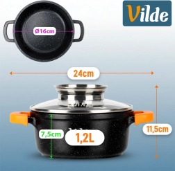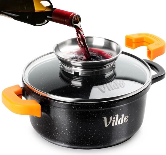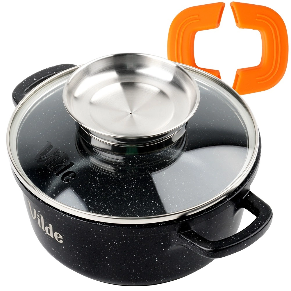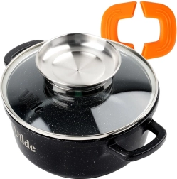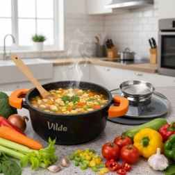 Ergonomische Silikonüberzüge an den Griffen gewährleisten einen sicheren, bequemen Halt auch bei hohen Temperaturen. Der starke Boden mit Induktionsplatte verteilt die Wärme gleichmäßig, verkürzt die Garzeit und steigert die Effizienz. Der Topf ist für alle Herdarten geeignet und spülmaschinenfest.