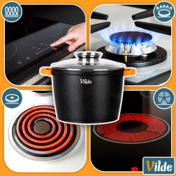 Der Topf ist mit allen Herdarten einschließlich Induktion kompatibel und hitzebeständig. Die Silikonüberzüge an den Henkeln sind rutschfest und erleichtern die Handhabung. Dank des eleganten Designs können Sie Speisen direkt auf dem Tisch servieren.