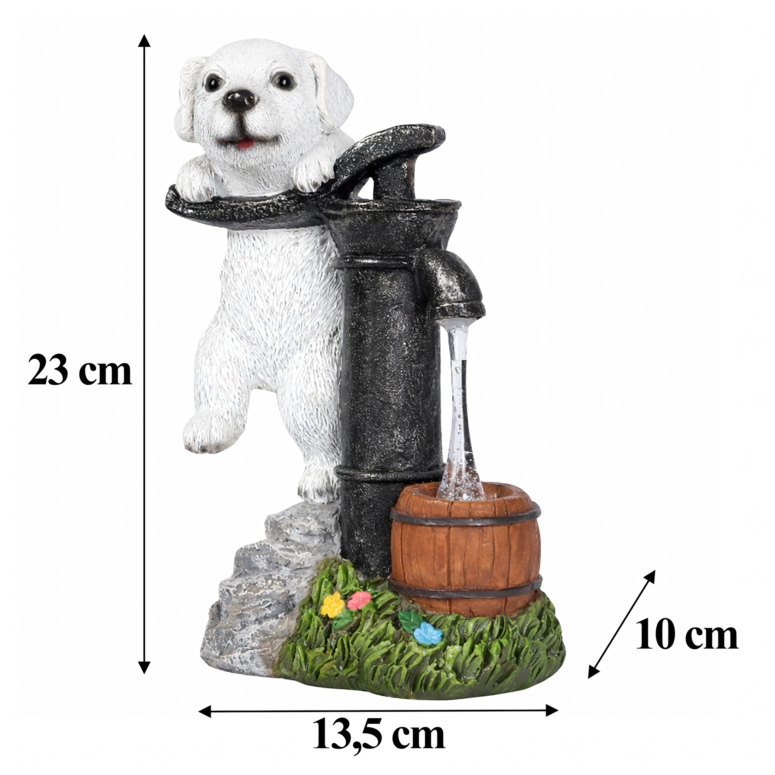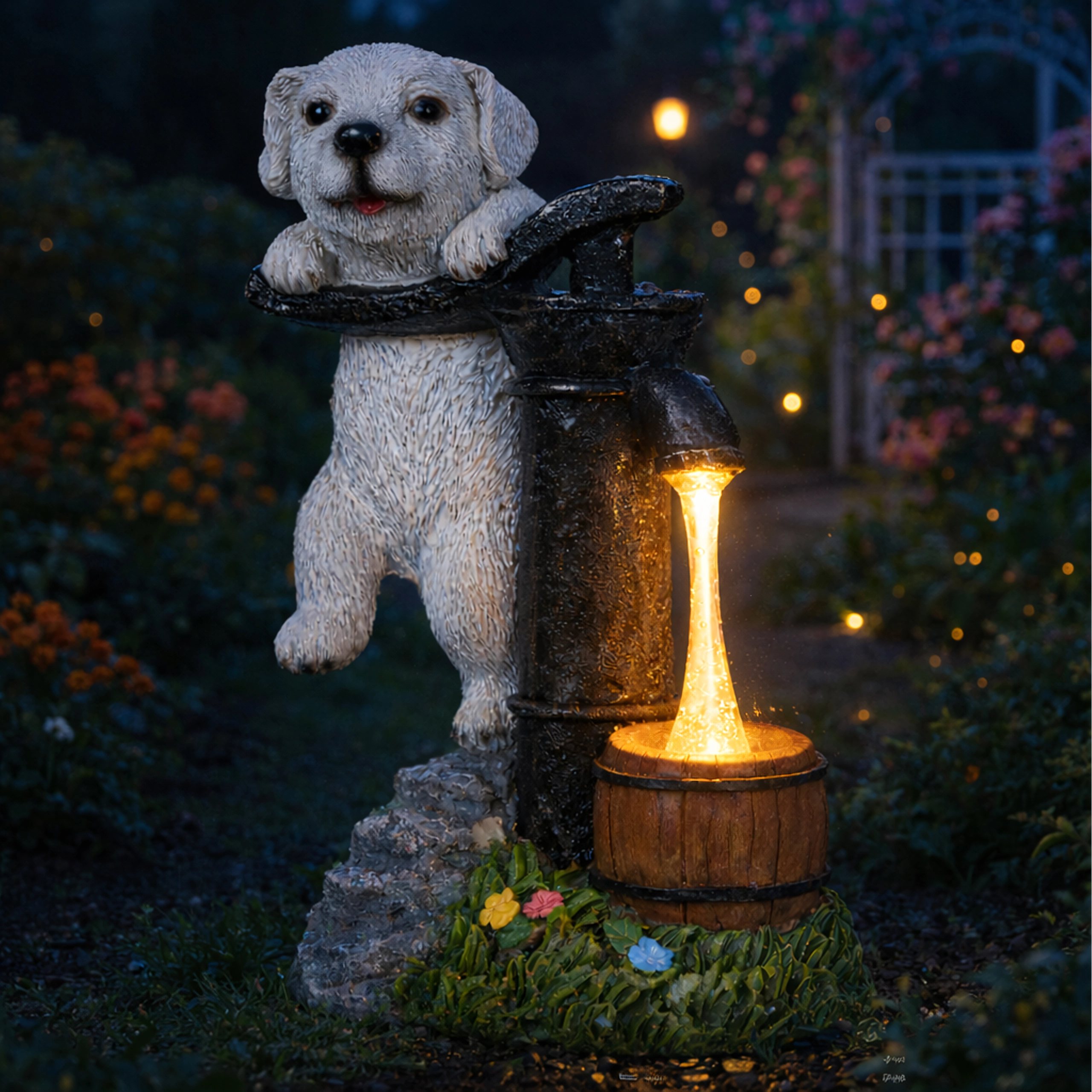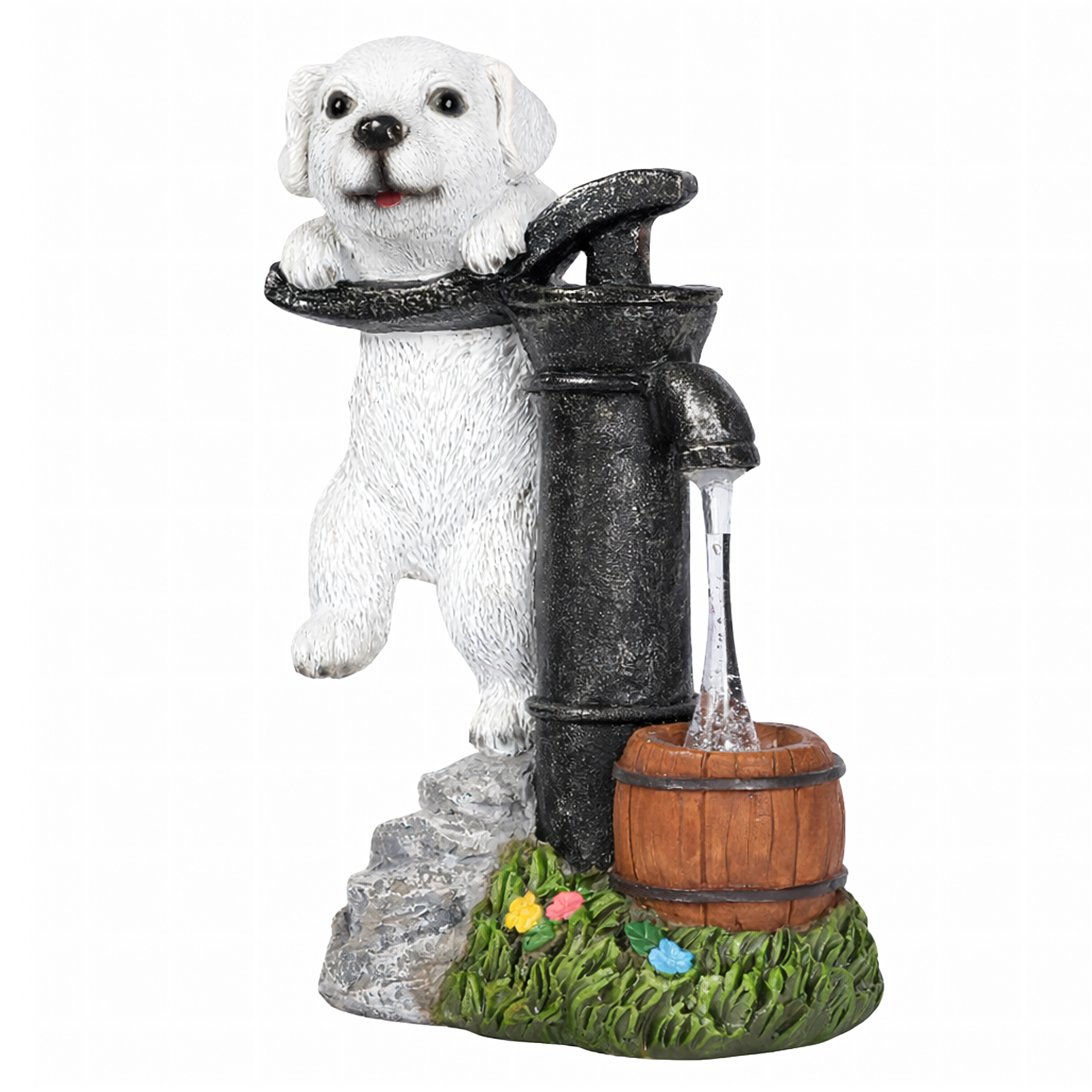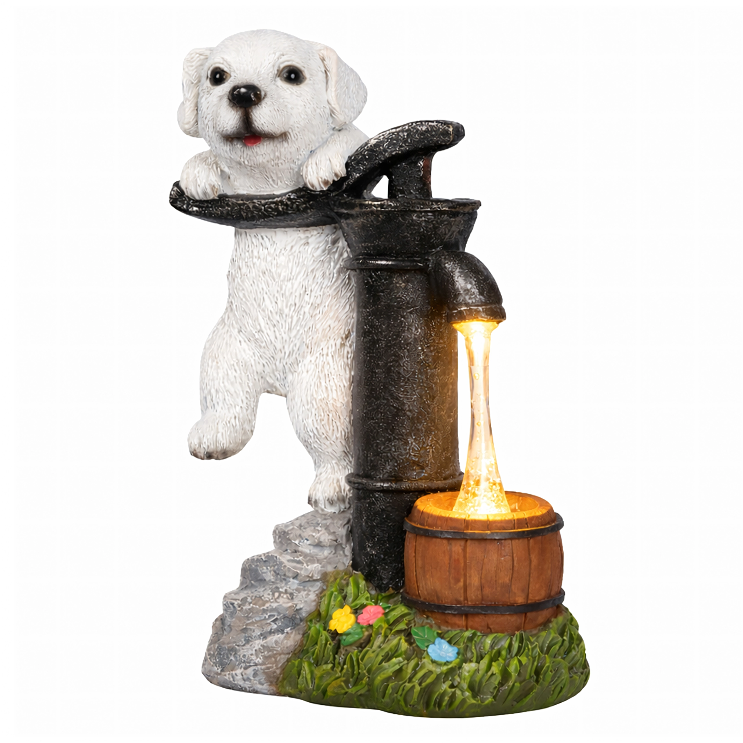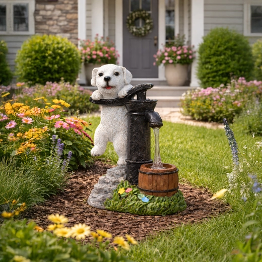 Die realistische Welpenfigur an der alten Pumpe mit Holzfässchen sowie Stein- und Grasstrukturen passt zu Wegen, Beeten und auf die Terrasse.