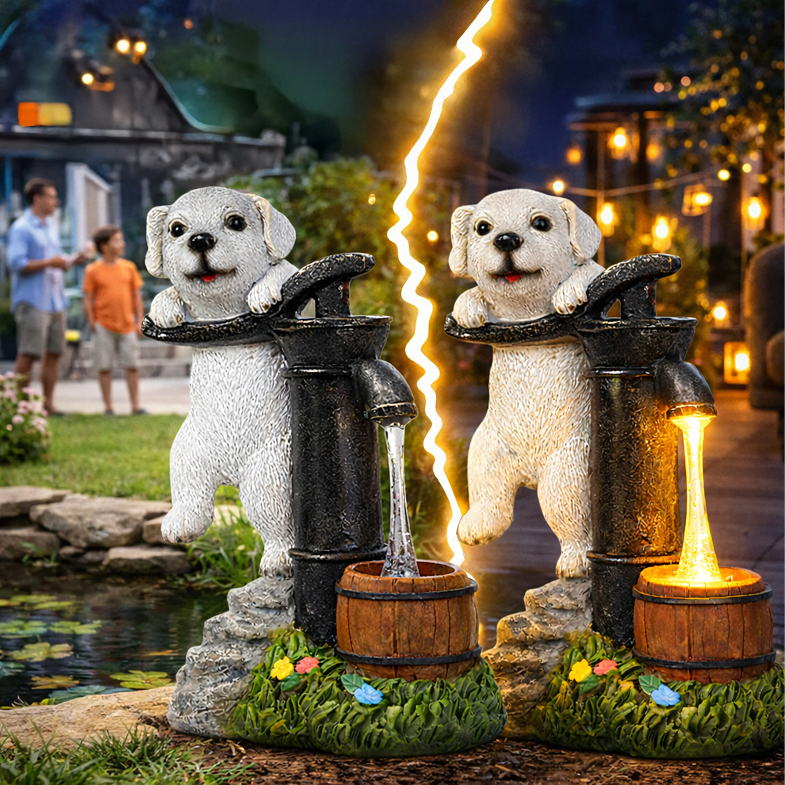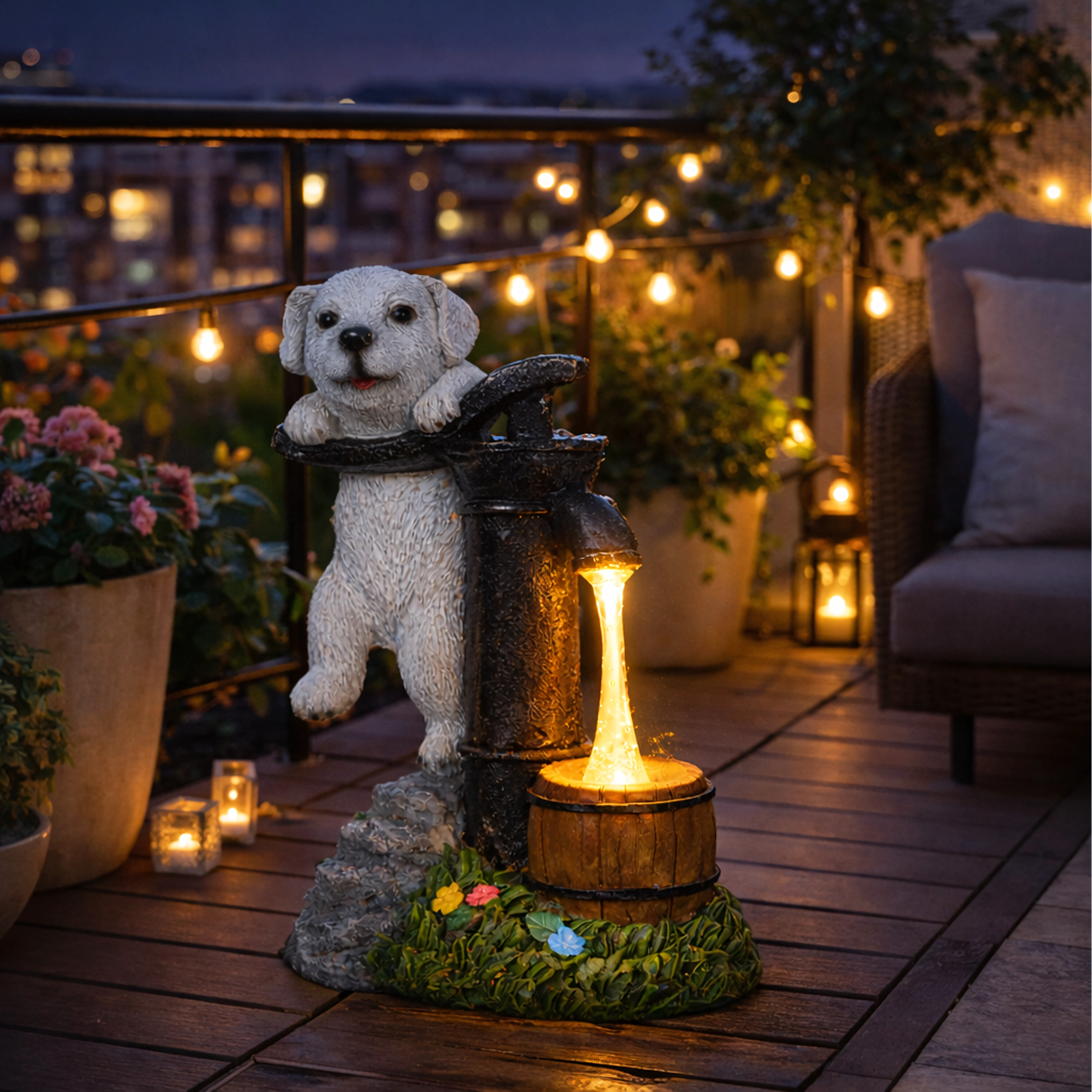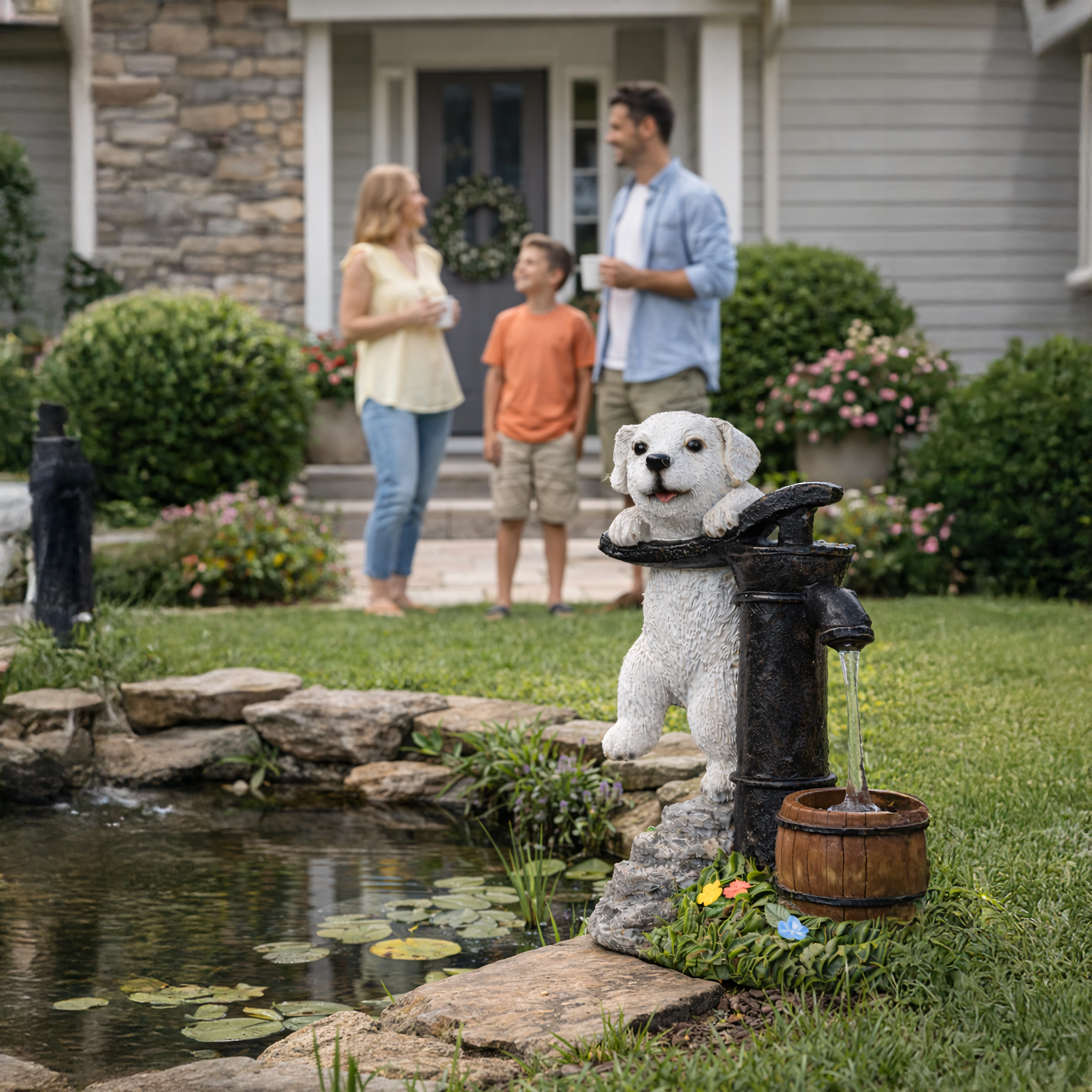 Die realistische Welpenfigur an der alten Pumpe mit Holzfässchen sowie Stein- und Grasstrukturen passt zu Wegen, Beeten und auf die Terrasse.