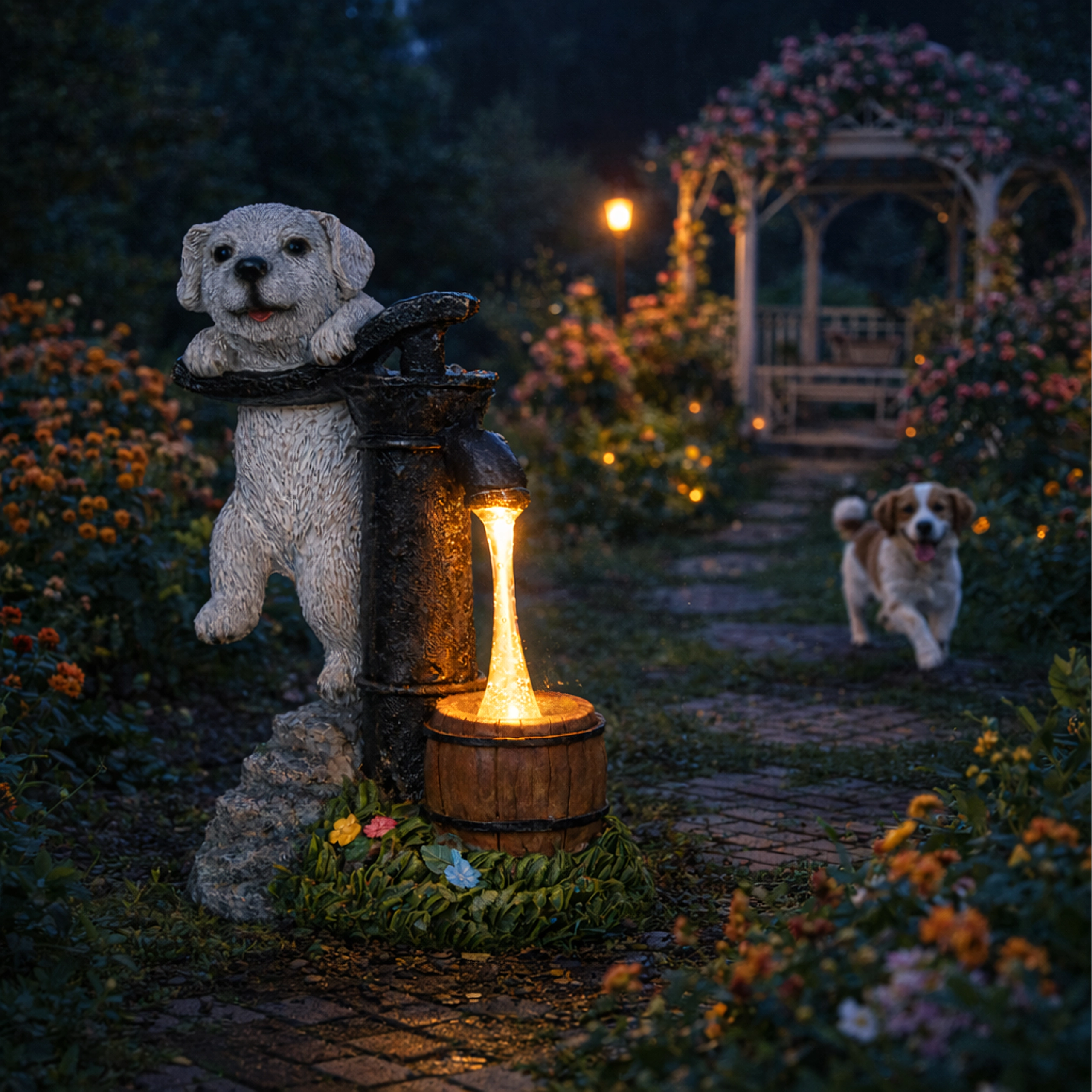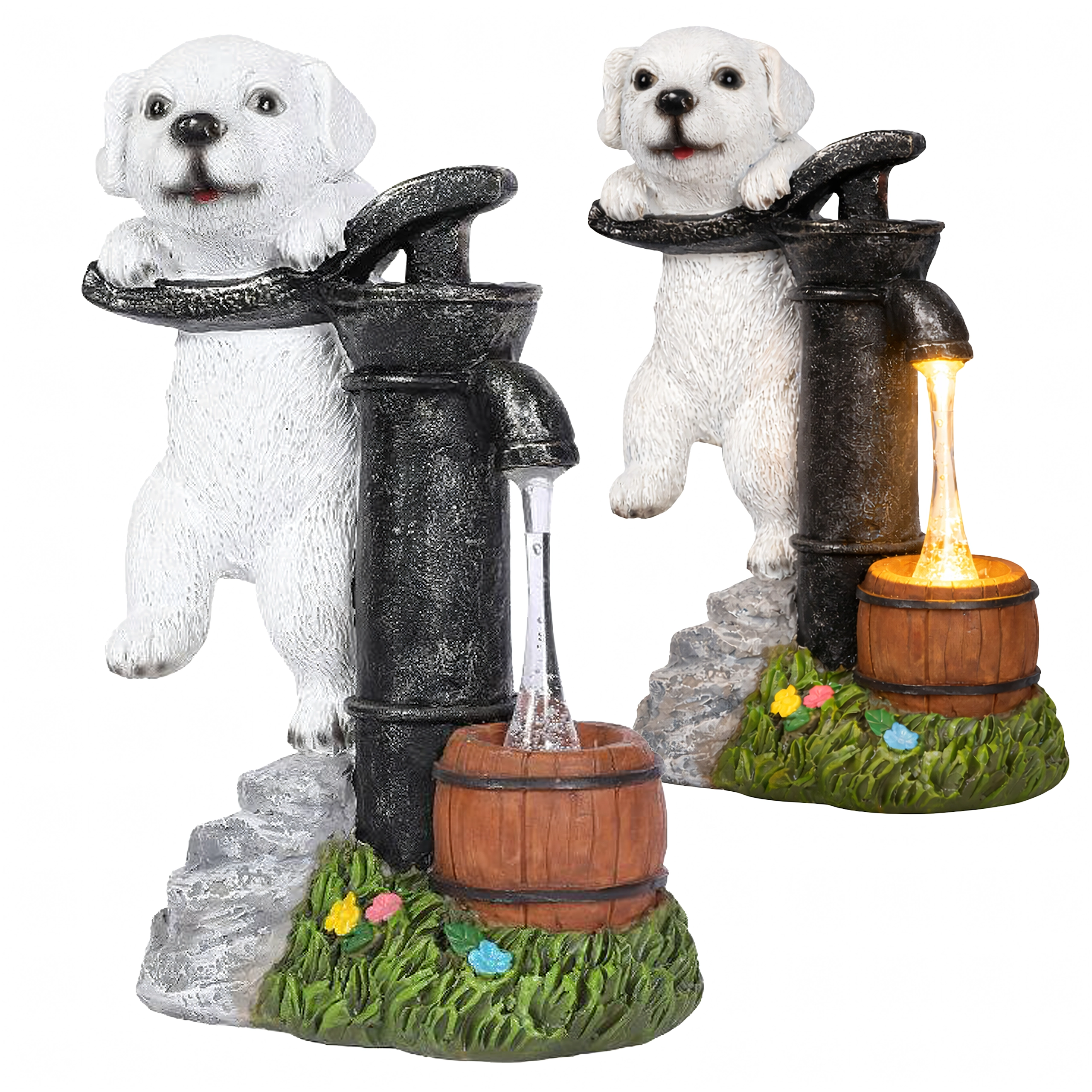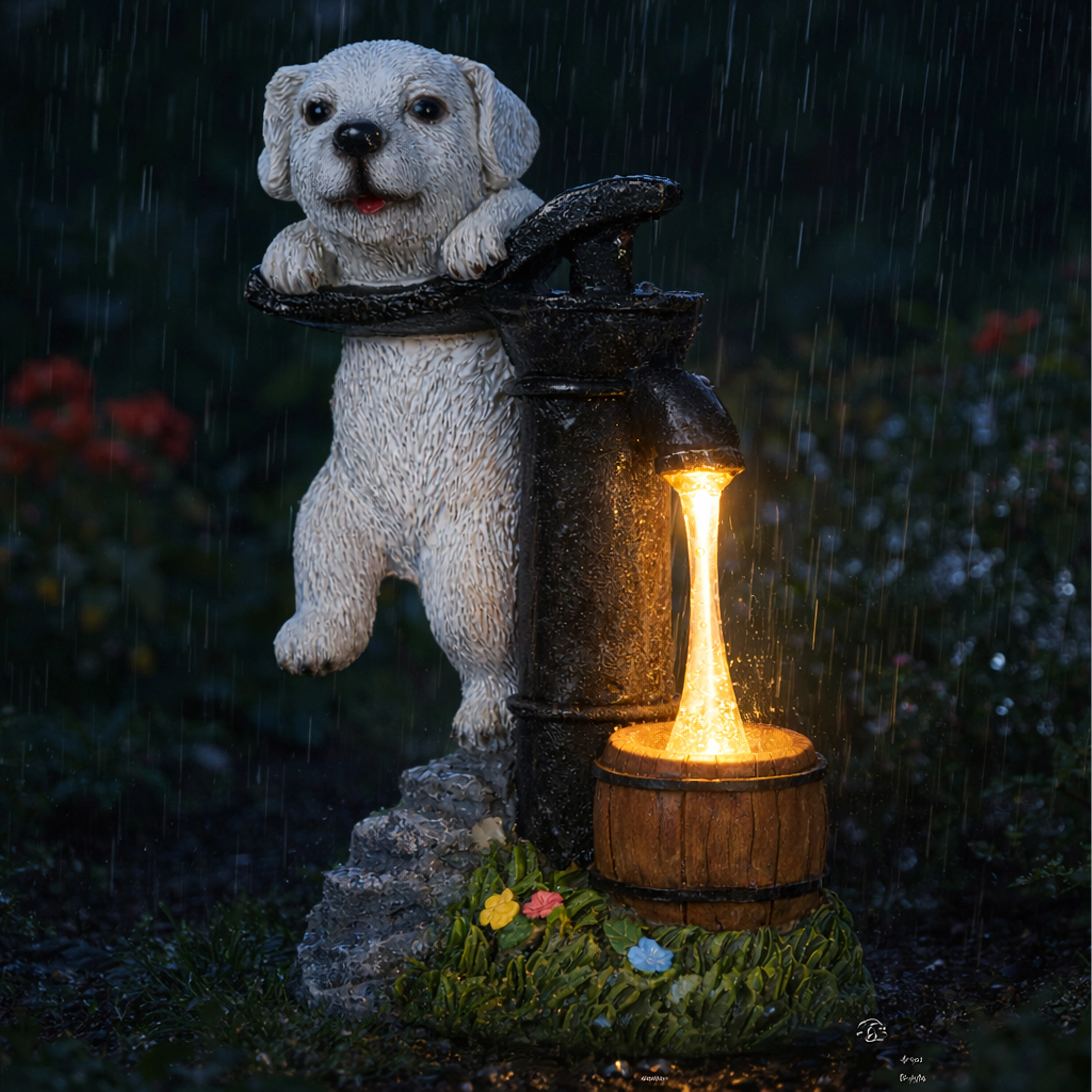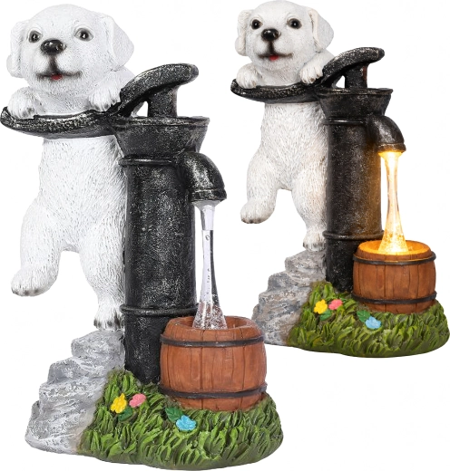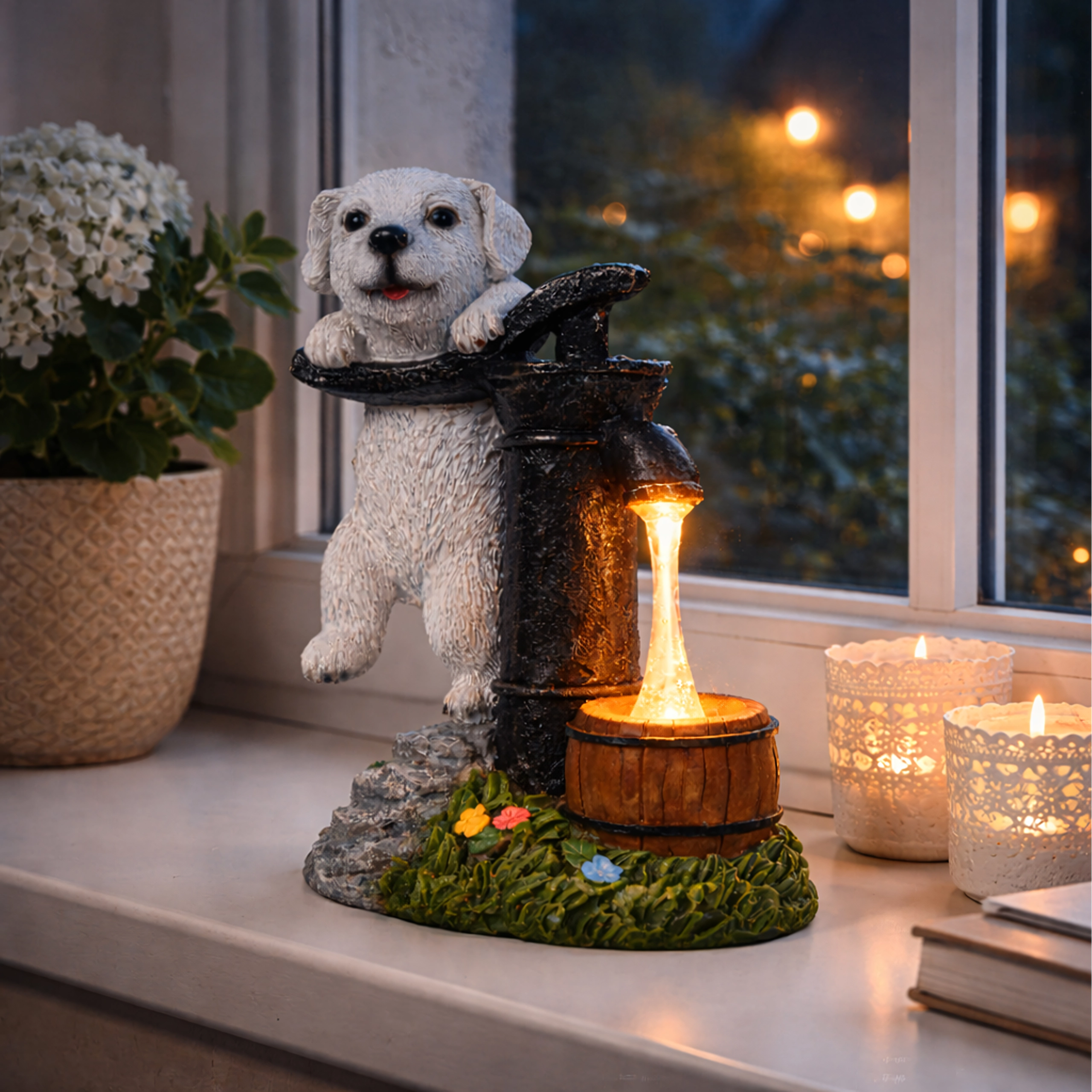 Die realistische Welpenfigur an der alten Pumpe mit Holzfässchen sowie Stein- und Grasstrukturen passt zu Wegen, Beeten und auf die Terrasse.