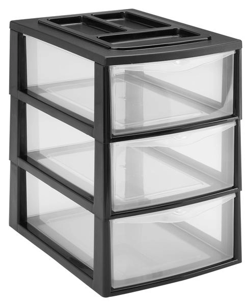 Organisieren Sie Ihre Dinge smart und mühelos. Das Kunststoffregal HEIDRUN bietet 3 tiefere transparente Schubladen, die Dokumente, Spielzeug, Kosmetik sowie Reinigungsmittel aufnehmen. Bereits montierte Lieferung bedeutet sofortige Nutzung ohne Montage. Die leichte, aber stabile Konstruktion lässt sich einfach tragen und dank der ebenen Oberseite können die Regale sicher gestapelt werden.