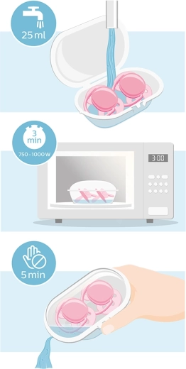 Die praktische Box aus 90 % pflanzlichem Material ermöglicht eine schnelle Sterilisation in der Mikrowelle – der Schnuller ist jederzeit einsatzbereit.