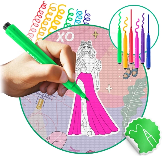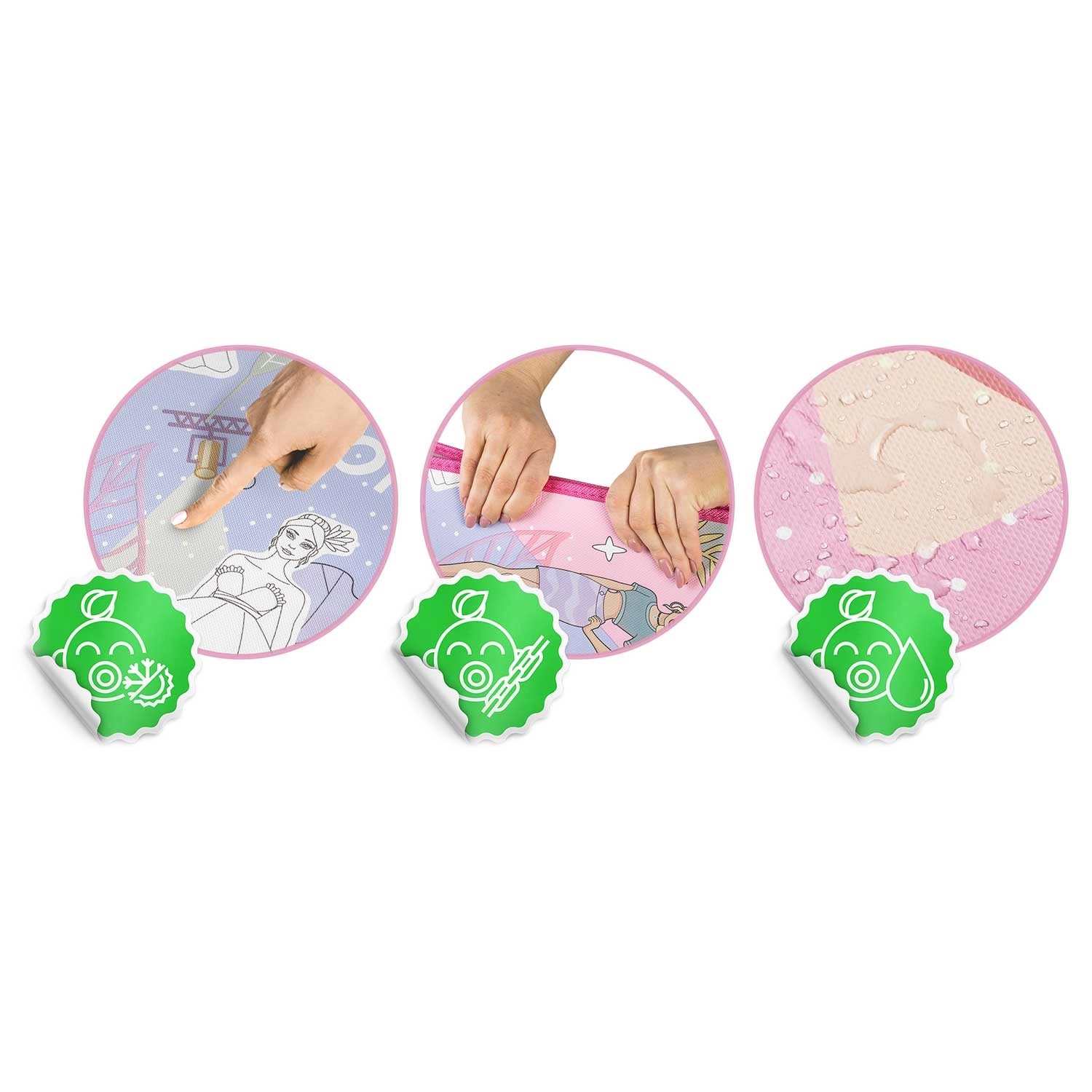 Die spezielle Oberfläche der Unterlage ermöglicht immer wieder neues Zeichnen. Die Farben trocknen schnell und lassen sich einfach mit einem feuchten Tuch abwischen – ganz ohne Reinigungsmittel.