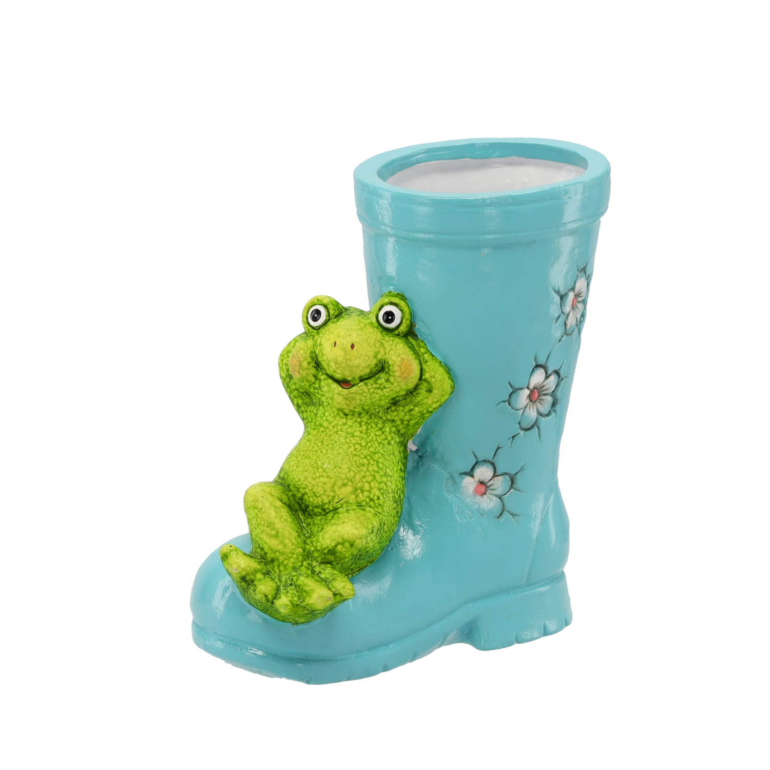 Dieser Design-Blumentopf in Form eines Stiefels mit Frosch belebt mühelos jede Ecke. Ideal für Kräuter, Sukkulenten und kleine Blumen; dank seiner kompakten Maße lässt er sich auf der Fensterbank, auf Stufen, auf dem Terrassentisch oder am Balkongeländer platzieren.
