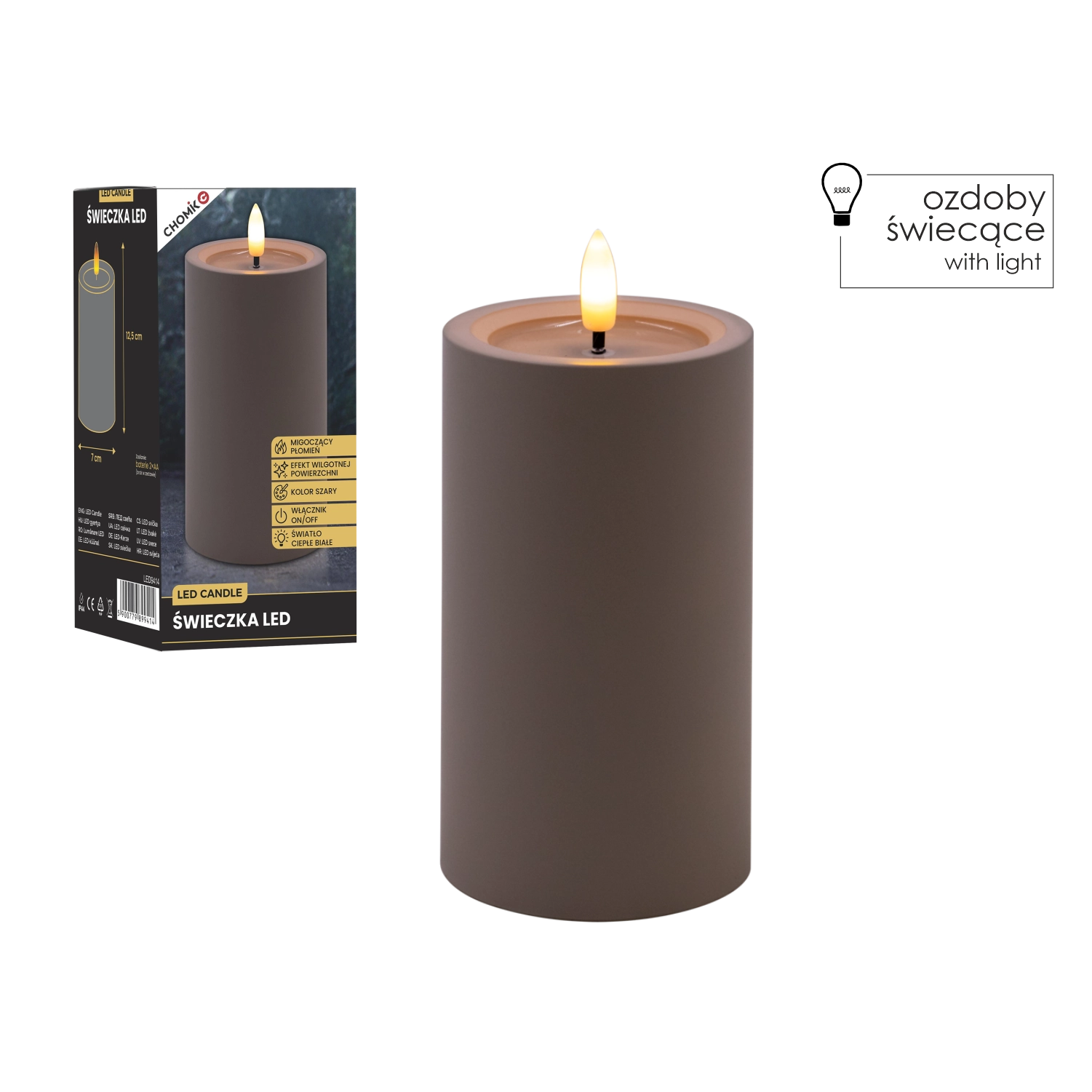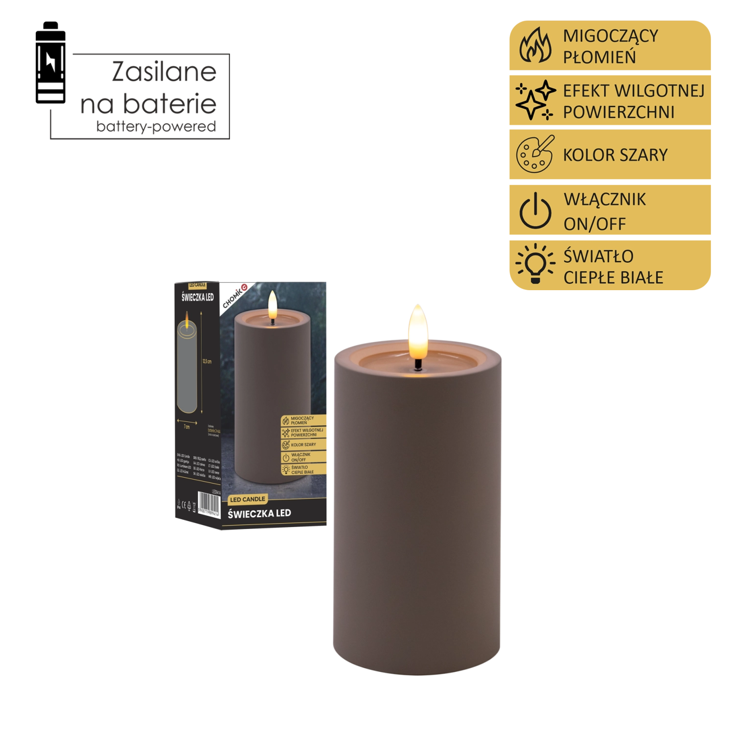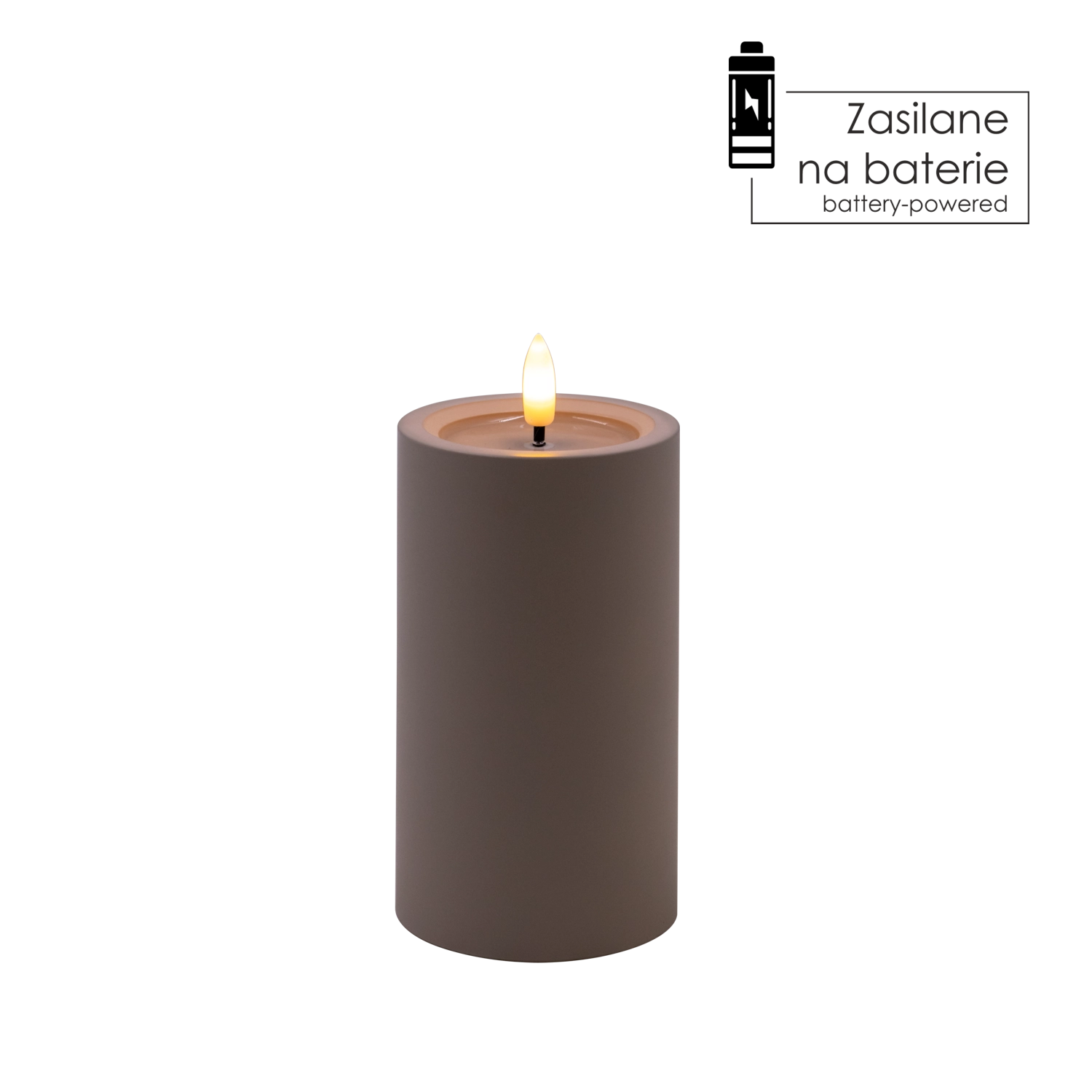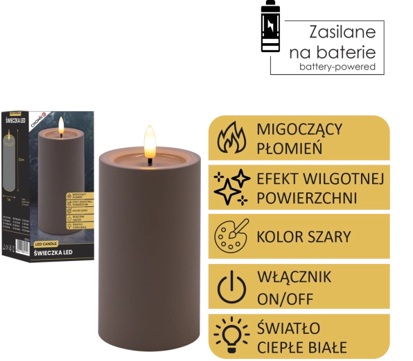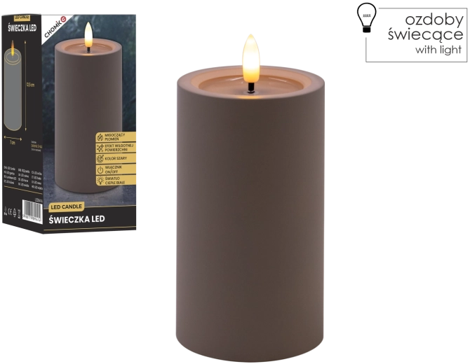 LED-Kerze grau 7 × 12,5 cm mit flackernder Flamme