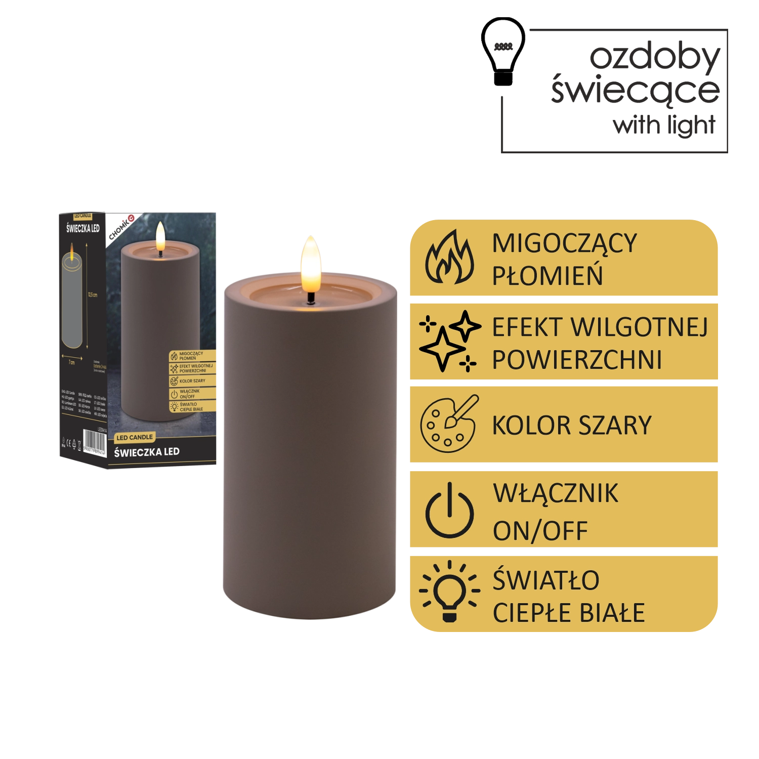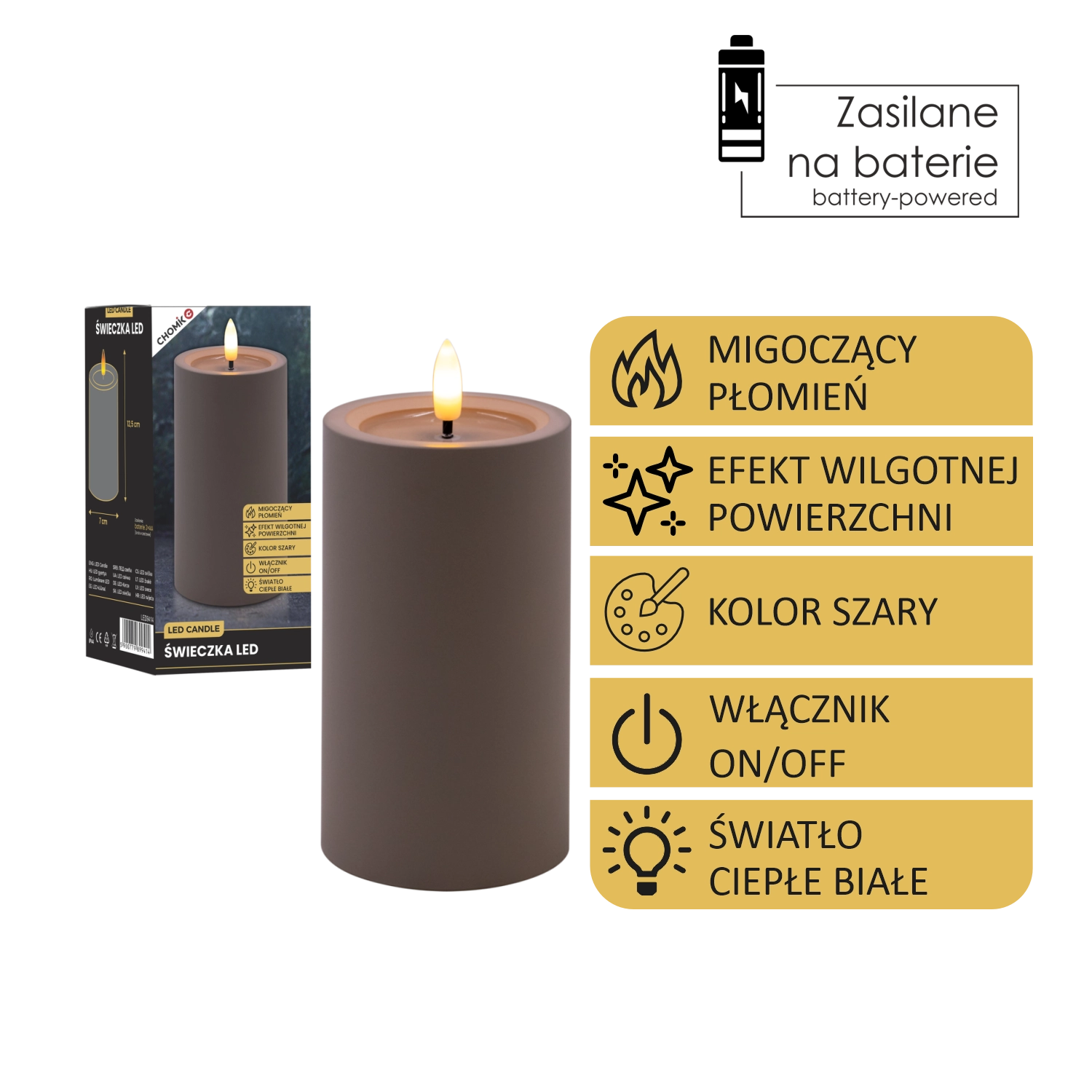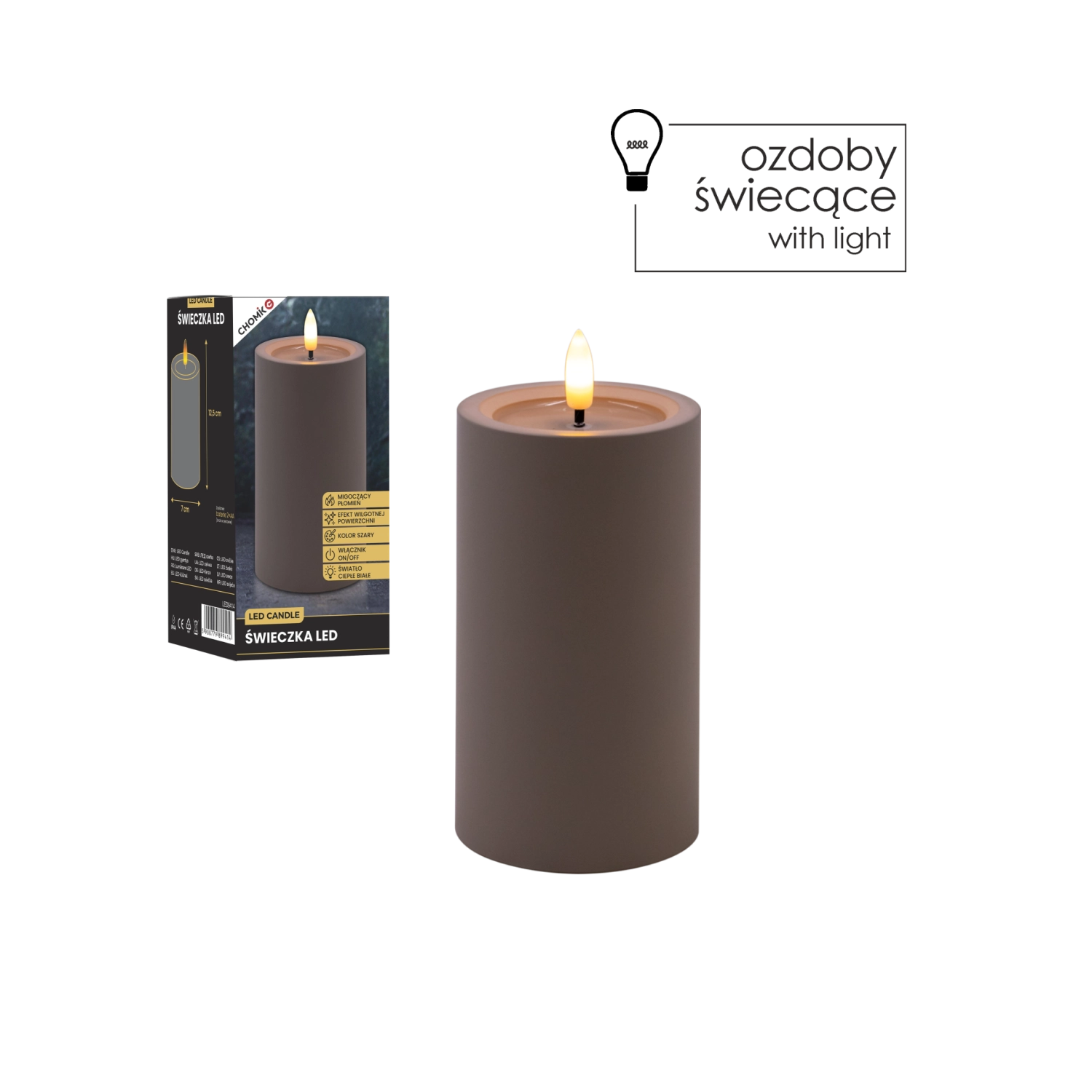 LED-Kerze grau 7 × 12,5 cm mit flackernder Flamme