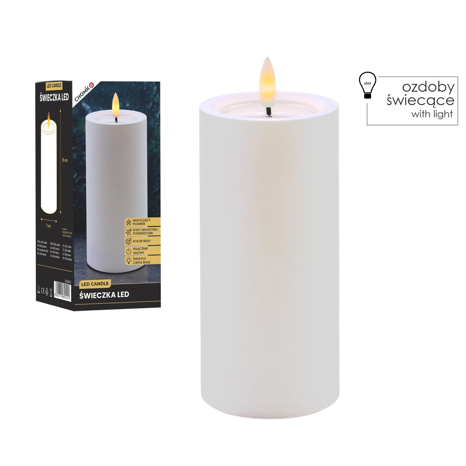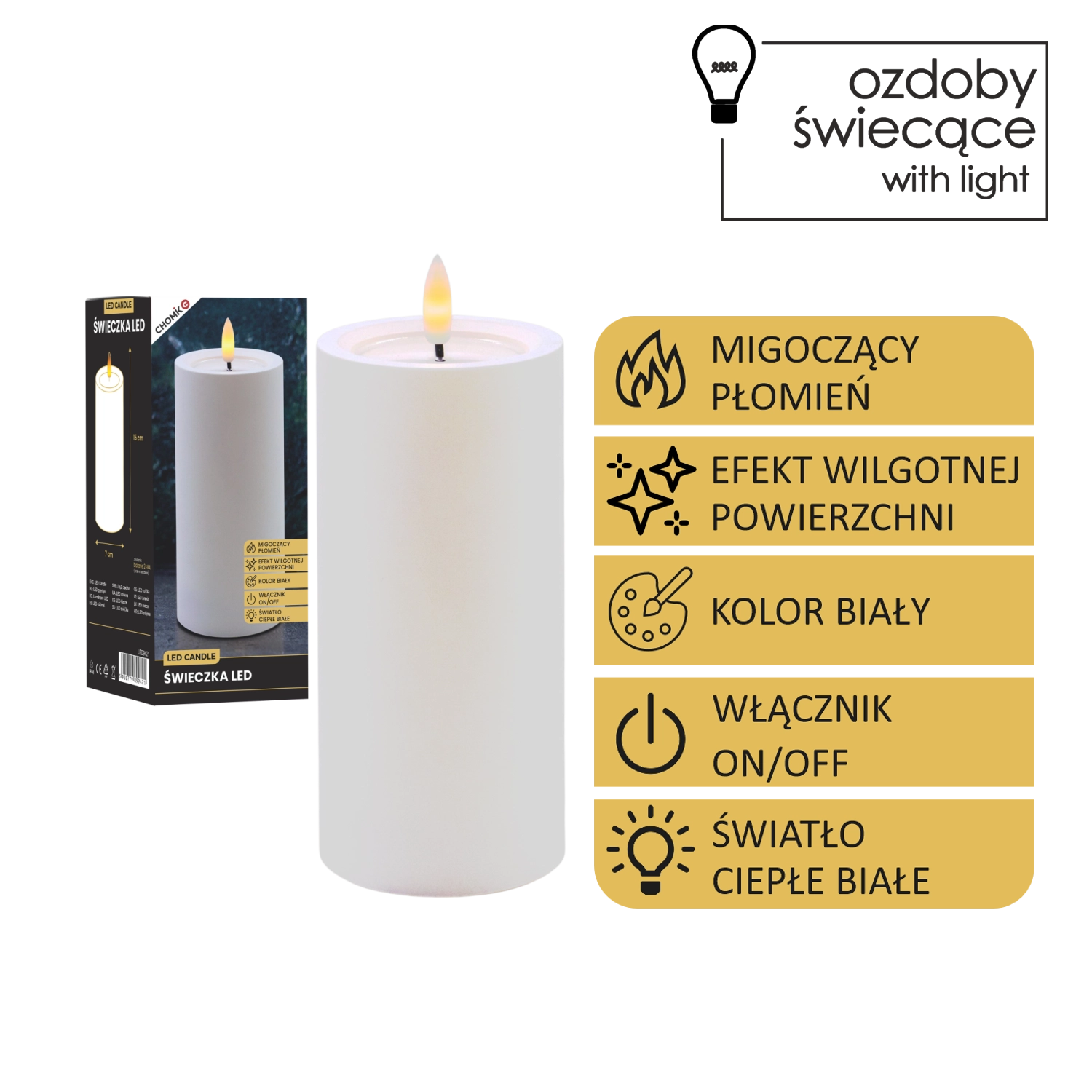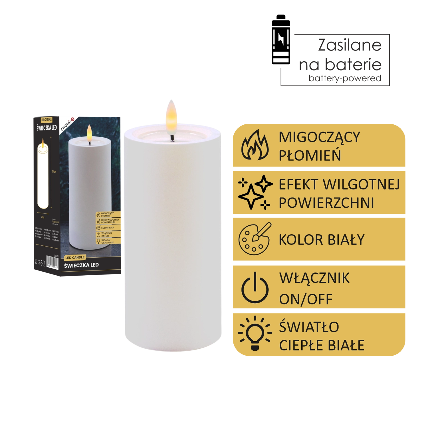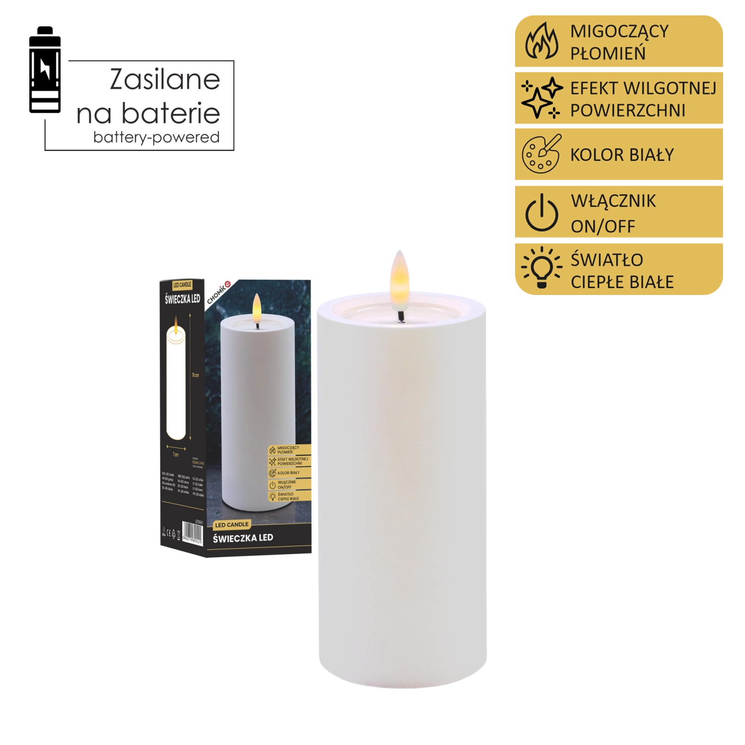 Elegante LED-Kerze in Weiß mit den Maßen 7 × 15 cm bietet eine realistisch flackernde Flamme in warmweiß sowie einen eindrucksvollen Effekt einer feuchten Oberkante. Ideal als Innendekoration ganz ohne Rauch und Schmutz.