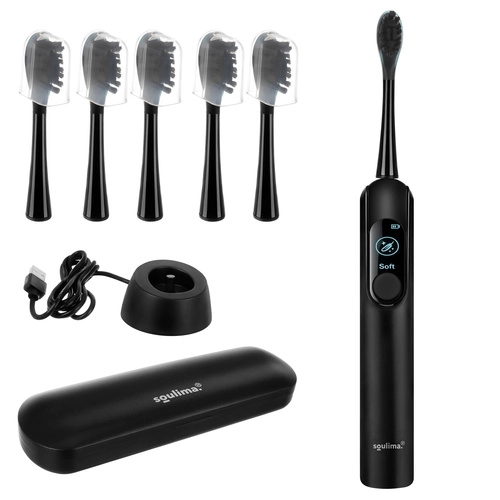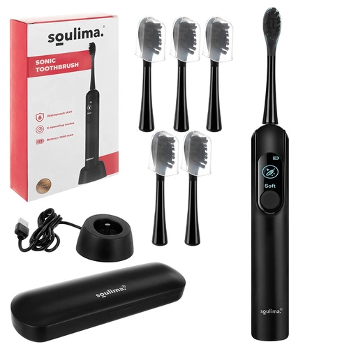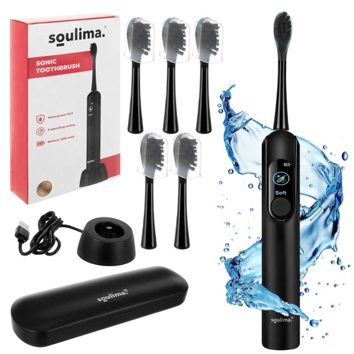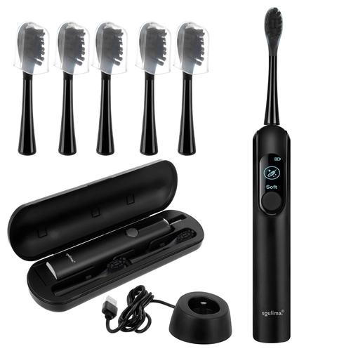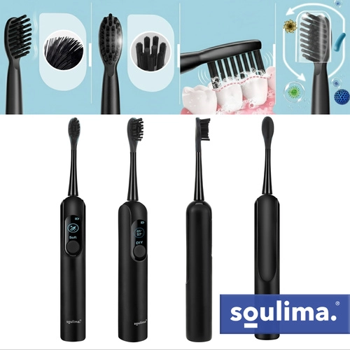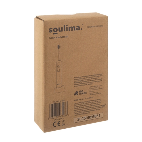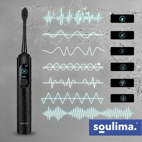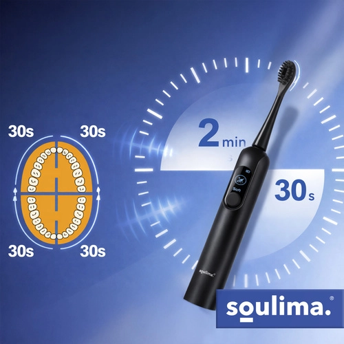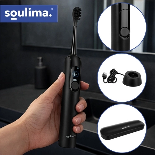 Die SOULIMA X800 ist eine moderne Schallzahnbürste für die tägliche Mundhygiene, die effektiver und schonender reinigt als eine Handzahnbürste. Hochfrequente Vibrationen helfen, Plaque und Bakterien auch an schwer erreichbaren Stellen zu entfernen, während der intelligente Timer Sie zu einer gleichmäßigen Reinigung der gesamten Mundhöhle anleitet.