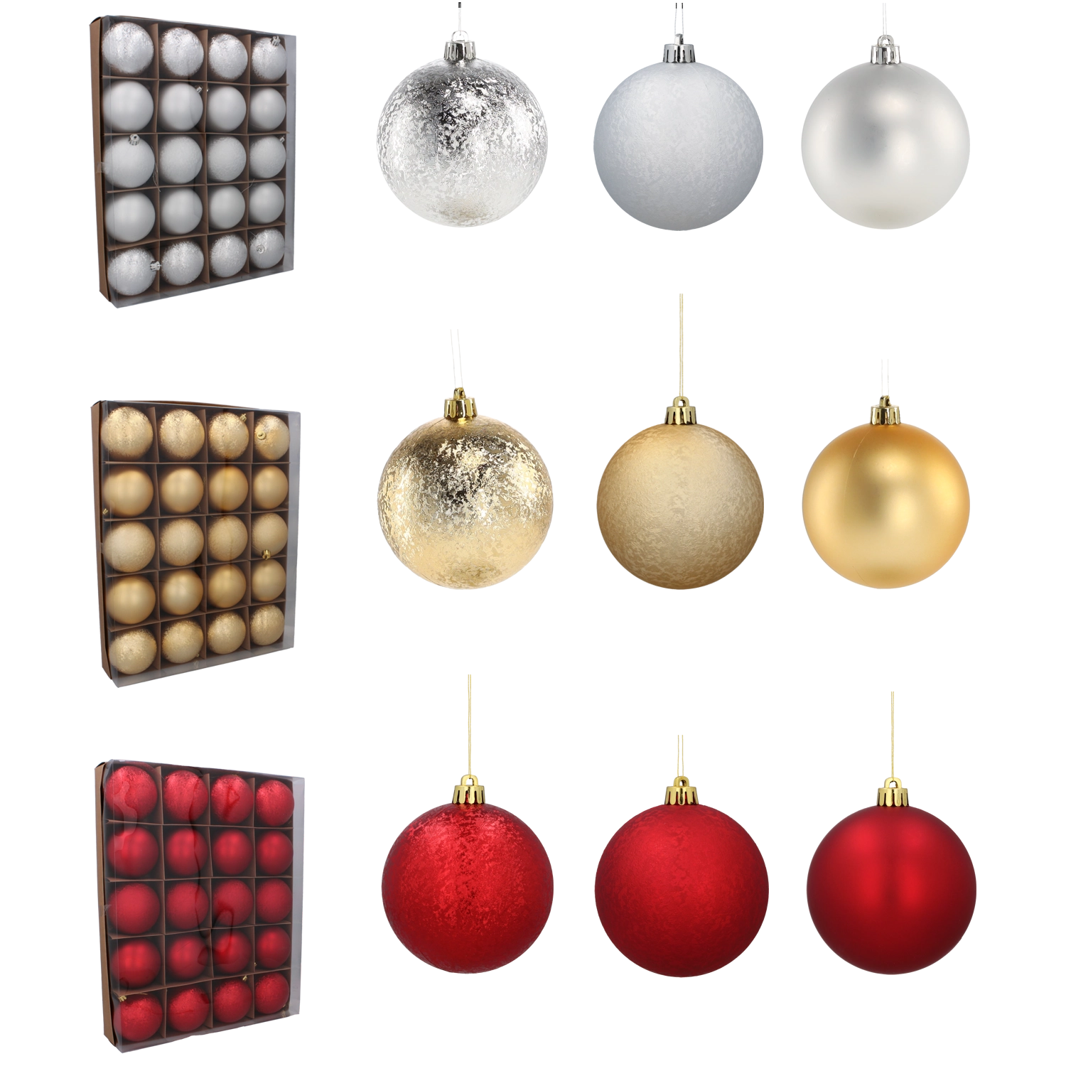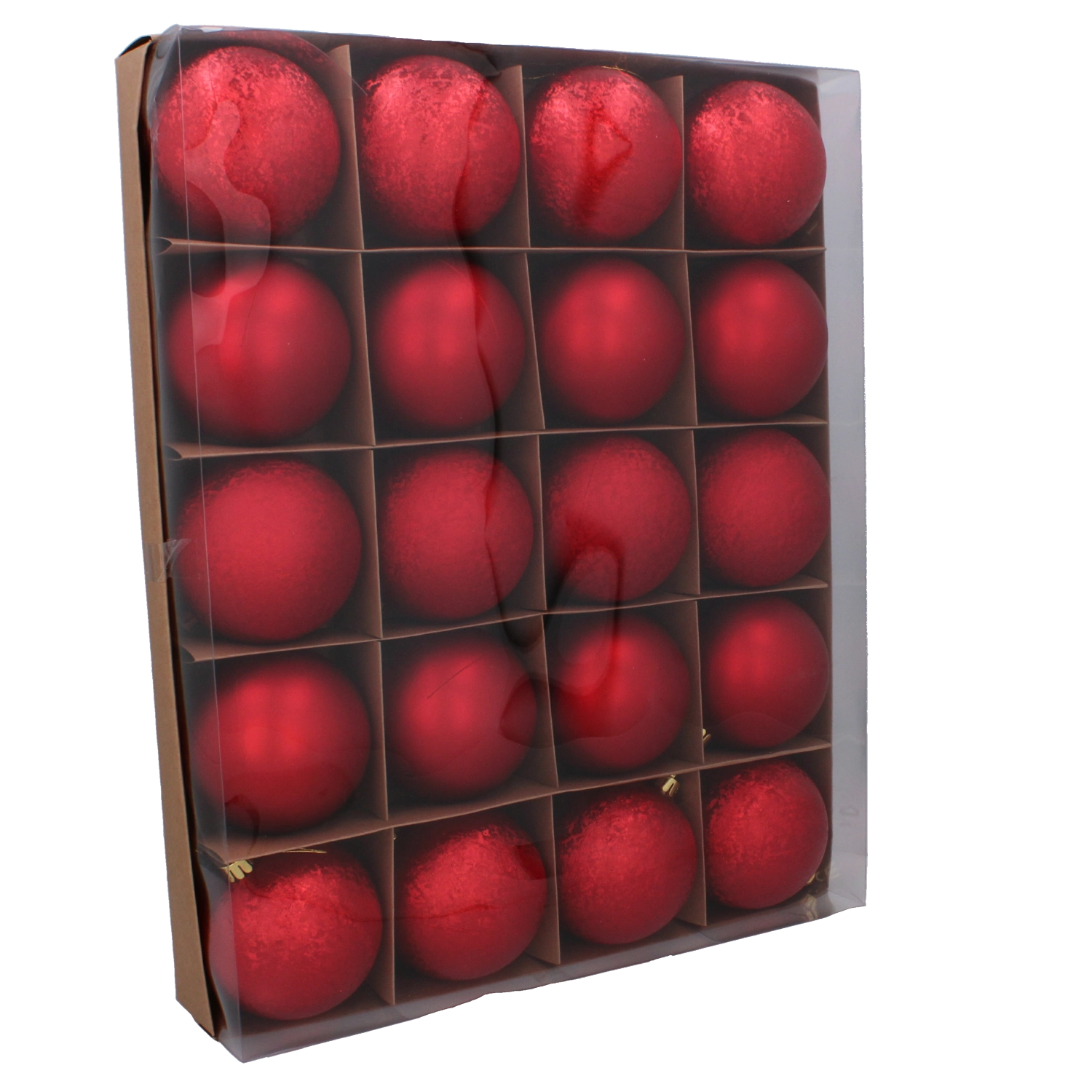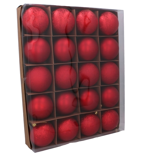 Dieses universelle Set enthält 20 Kugeln: 8× matt, 4× strukturiert und 8× glänzend. Dank des durchdachten Verhältnisses der Oberflächen erzeugen Sie mühelos Tiefe und Glanz am Baum, Kranz oder in dekorativen Arrangements. Die Farben Rot, Gold und Silber harmonieren wunderschön und unterstreichen die klassische Weihnachtsatmosphäre.