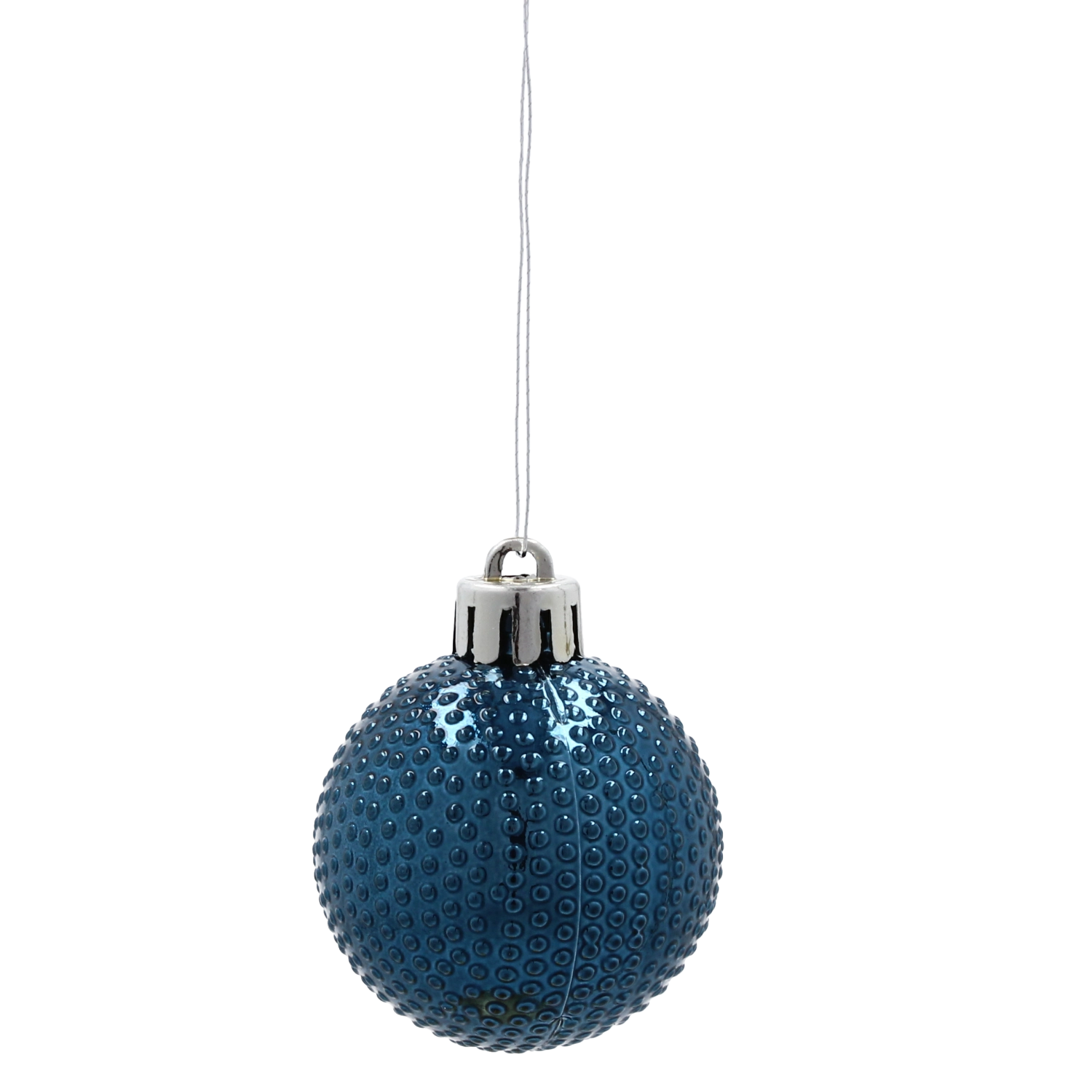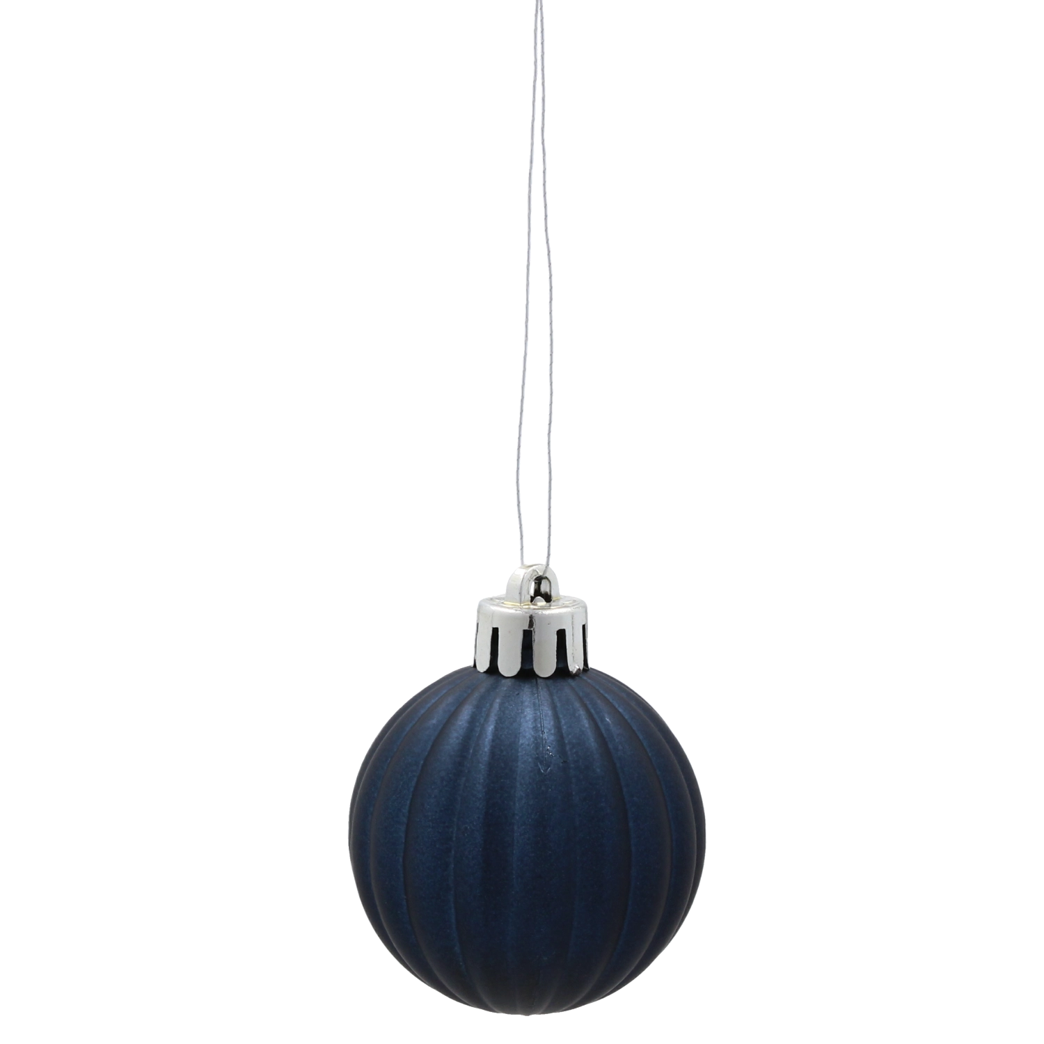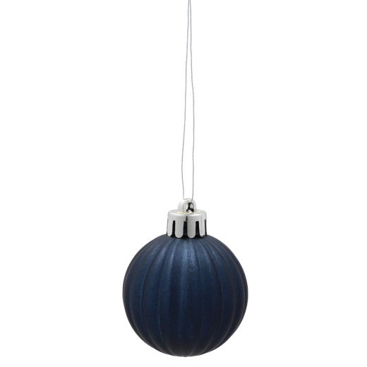 Glänzende dunkelblaue Kugeln mit Textur reflektieren das Licht besonders schön und unterstreichen die festliche Atmosphäre sowie den eleganten Look.