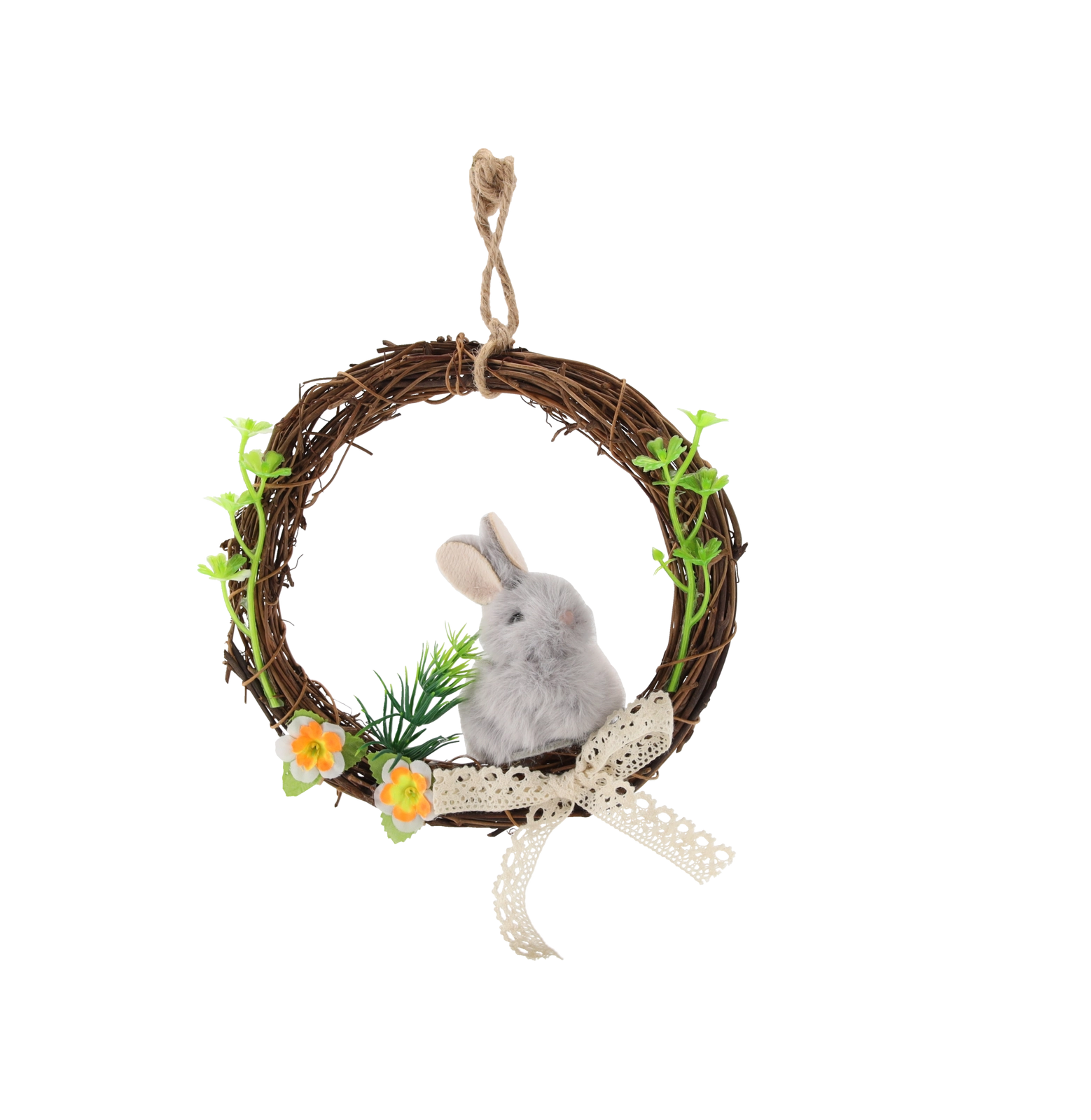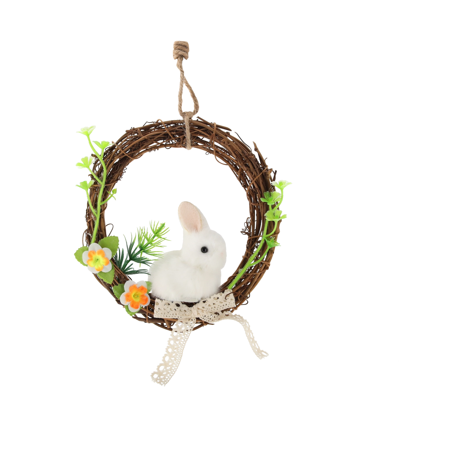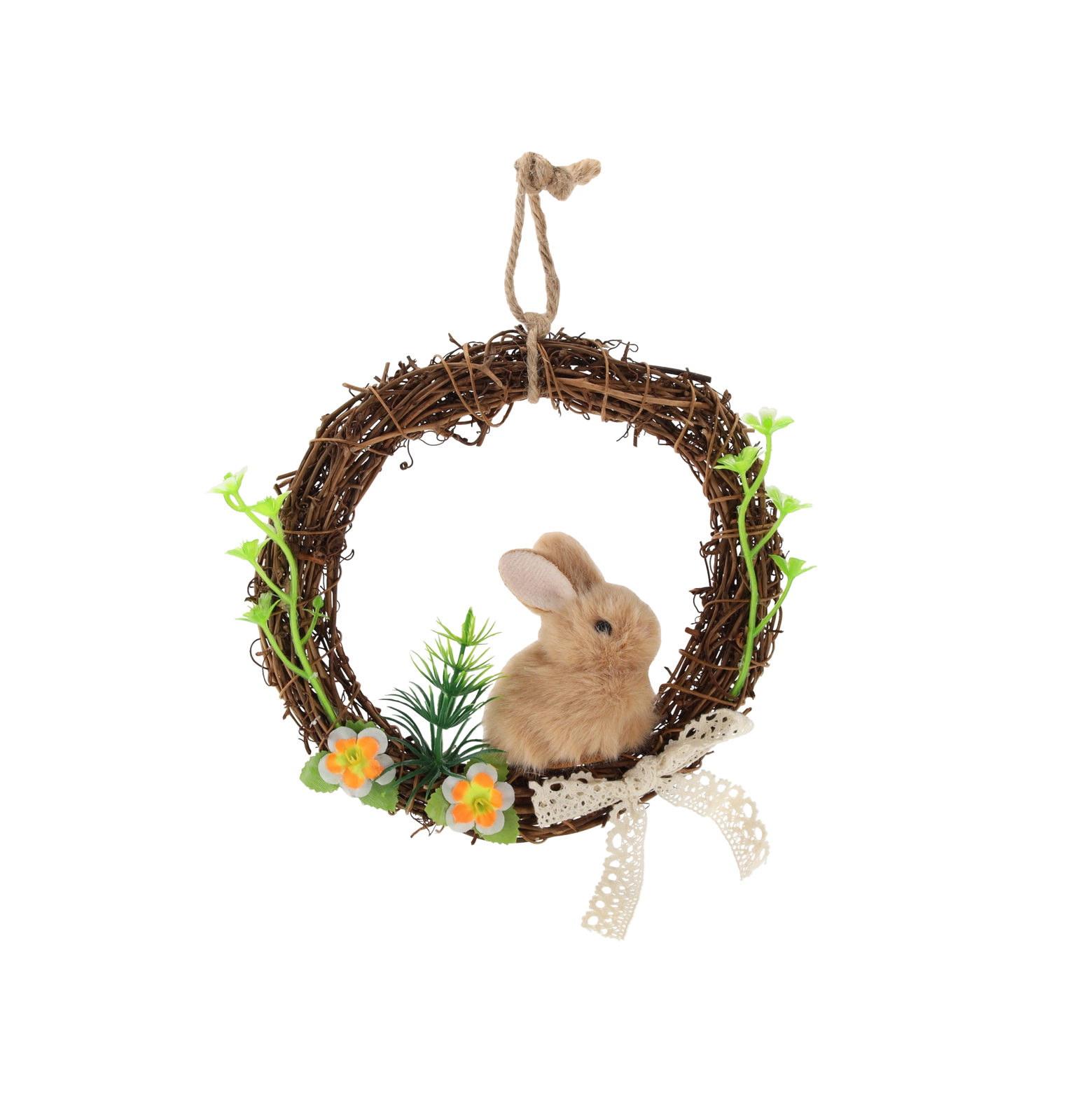 Ein weiches Plüschhäschen verleiht dem Kranz Verspieltheit und macht ihn zum idealen Osterakzent für Flur oder Wohnzimmer.