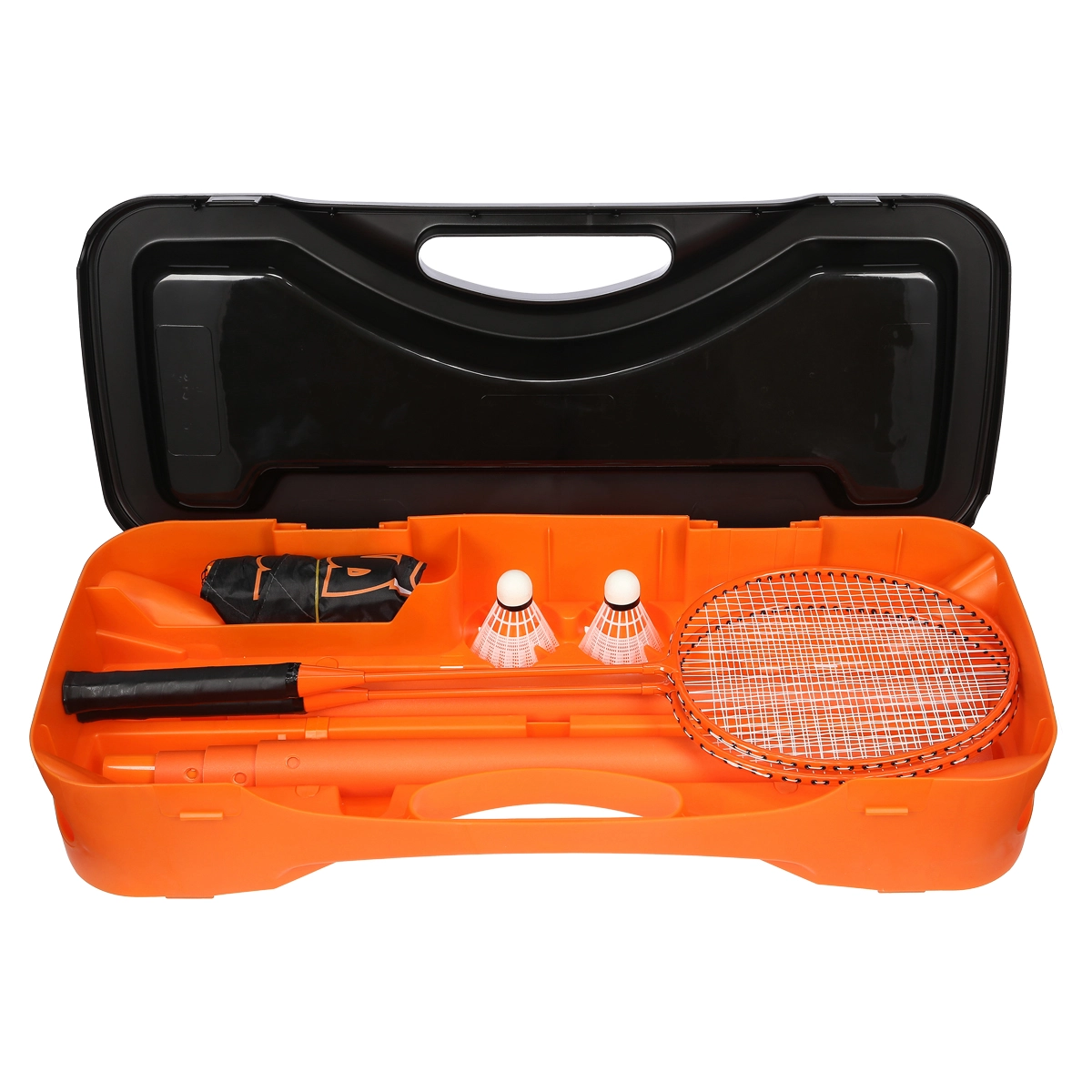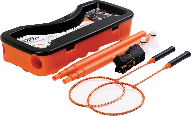 Das stabile Kunststoffetui mit Fächern hält Netz, Pfosten, Schläger und Federbälle übersichtlich und sicher verstaut. Leicht zu transportieren, und das Spiel ist überall schnell startklar.