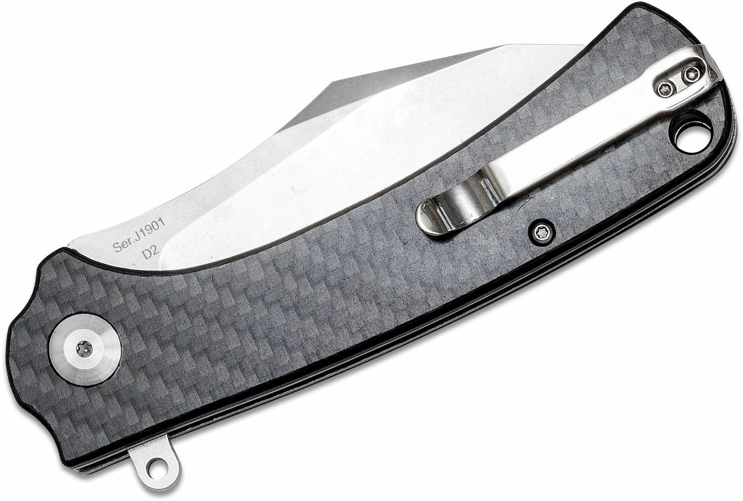 Die Öffnung erfolgt schnell und sanft per Flipper, für Sicherheit bei der Arbeit sorgt die Linerlock-Arretierung. Der ergonomische Griff aus Kohlefaser in Grau liegt ausgezeichnet in der Hand; der Taschenclip und die Lanyard-Öse erleichtern das tägliche Tragen.