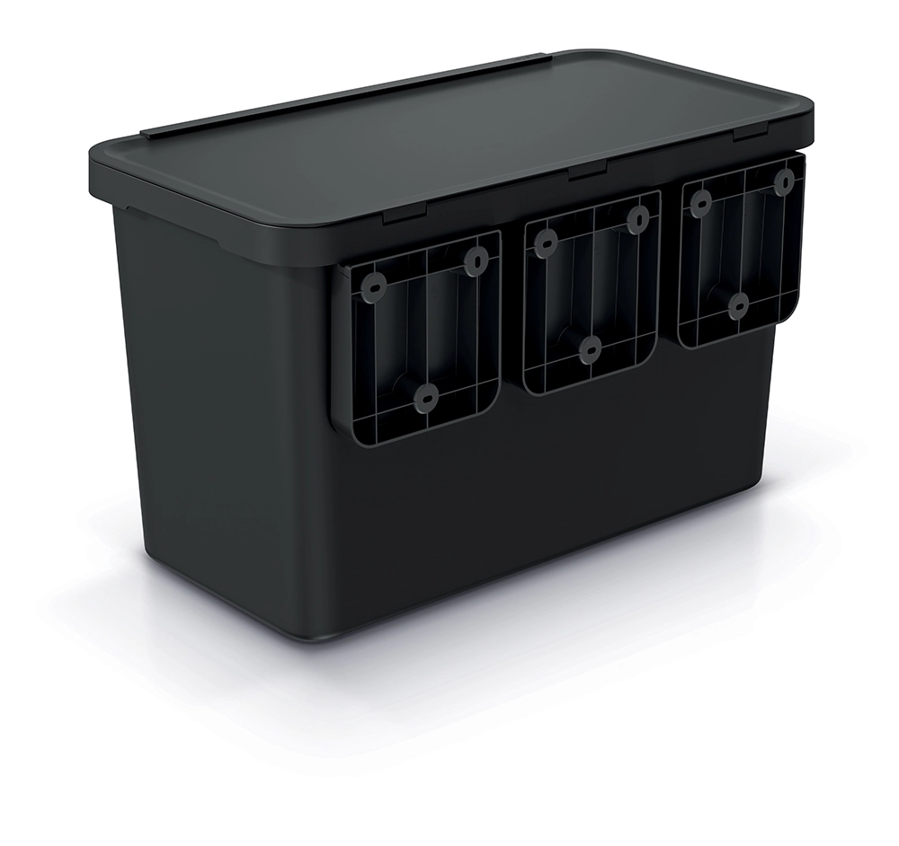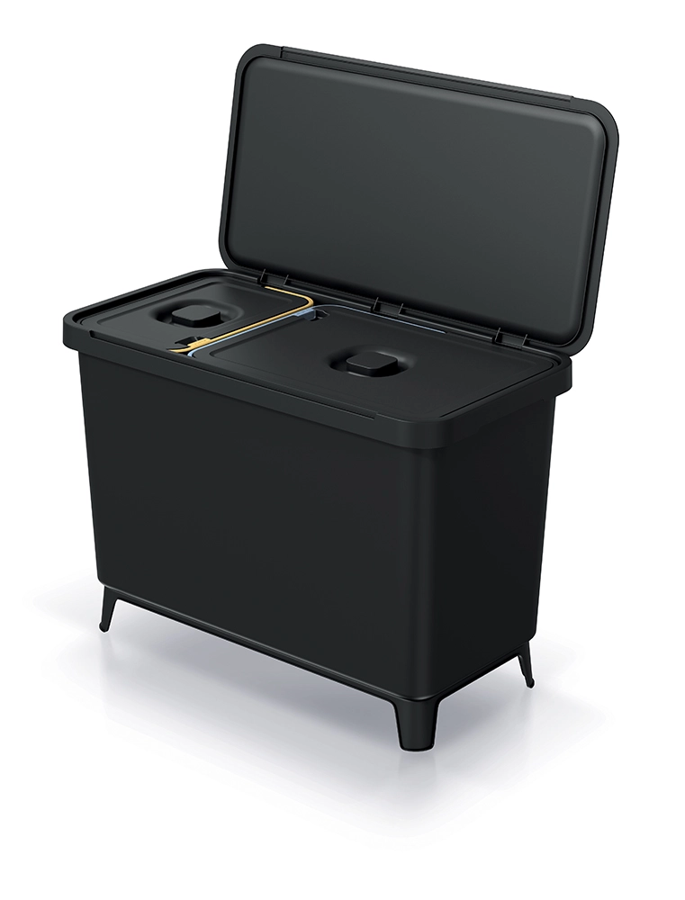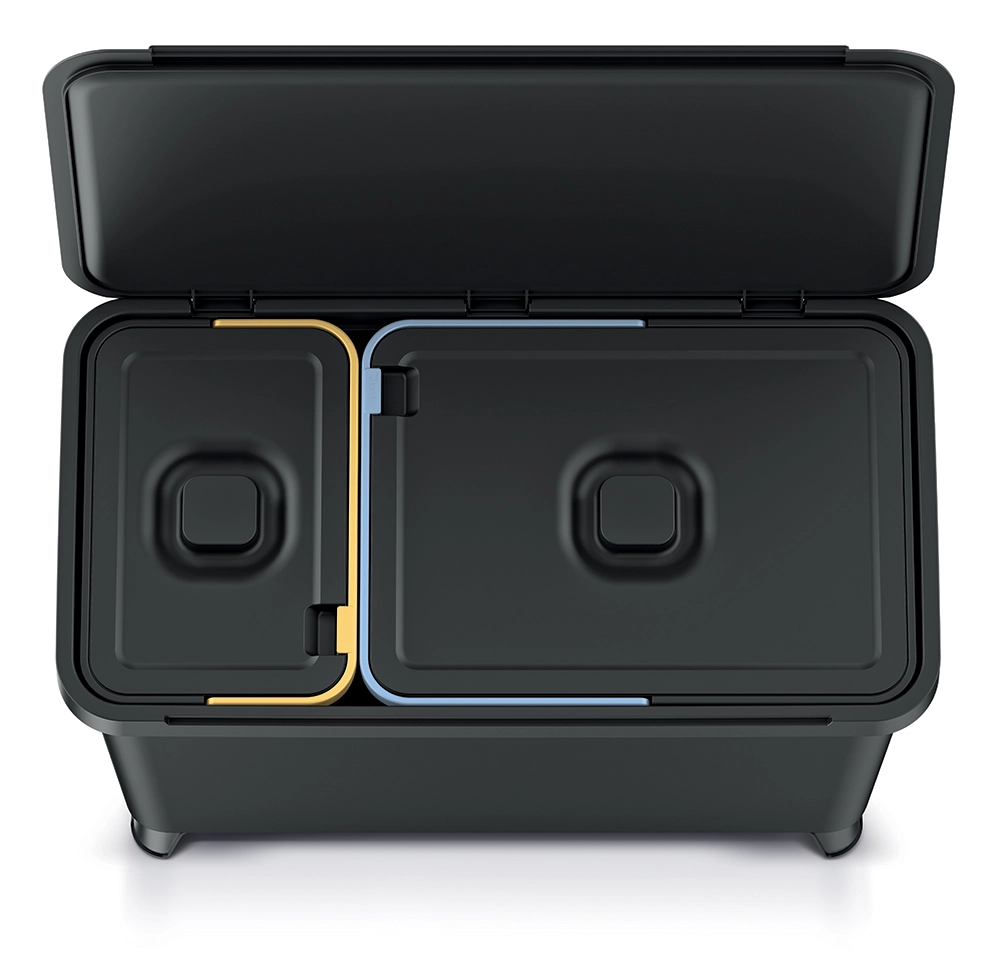 Effiziente Abfalltrennung ohne Kompromisse. Zwei separate Behälter (10 l + 23 l) ermöglichen eine bequeme Trennung nach Abfallarten. Dank der fest integrierten ABS-Griffe sind Handhabung, Entleeren und Reinigung besonders einfach. Die moderne, recycelte schwarze Farbe und die klaren Linien des Eimers sorgen dafür, dass er das Erscheinungsbild Ihrer Küche, Ihres Badezimmers oder Büros nicht stört.