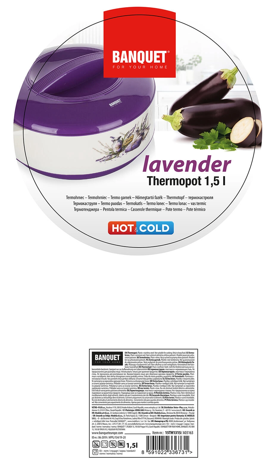Die praktische Thermoschüssel LAVENDER mit einem Fassungsvermögen von 1,5 l hält Ihre Speisen dank hochwertigem Edelstahleinsatz und PUR‑Isolierung lange warm oder kalt. Das elegante Lavendel‑Dekor, der feste Deckel und seitliche Griffe erleichtern das Servieren und den sicheren Transport von Speisen.