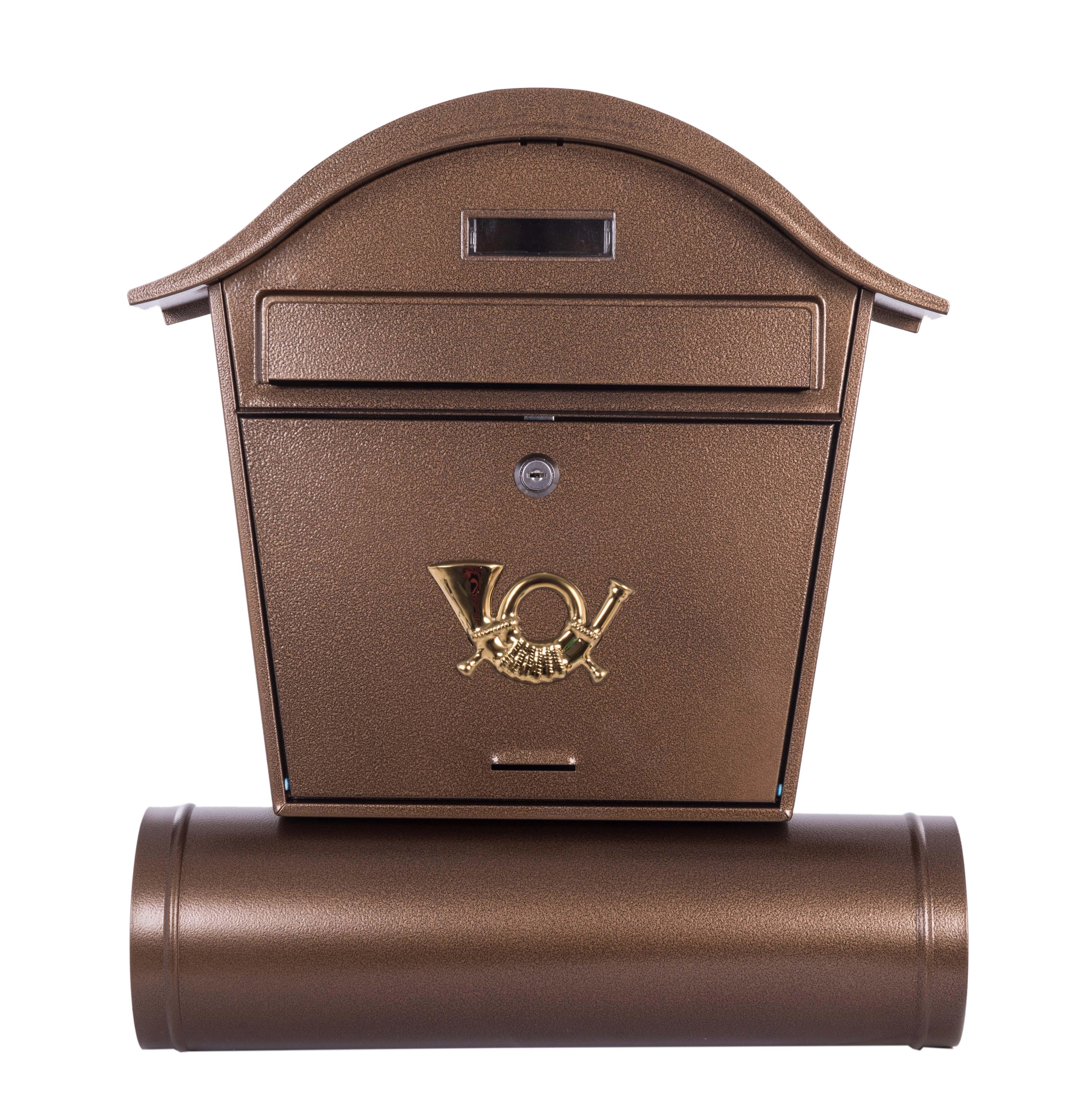 Eleganter Briefkasten mit gewölbtem Dach und integrierter Zeitungsrolle bietet ausreichend Platz für Briefe, Zeitschriften und Prospekte. Gefertigt aus hochwertigem Stahlblech mit robuster Oberfläche in brauner Hammerschlag-(antik-)Lackierung, die vor Witterungseinflüssen schützt. Abschließbare Tür mit zwei Schlüsseln und Abdeckung des Einwurfschlitzes sorgen für eine sichere und trockene Aufbewahrung der Post.