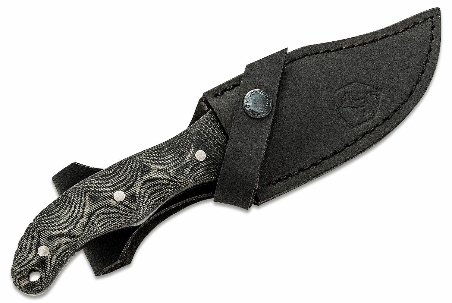 Die Full-Tang-Konstruktion sorgt für hohe Stabilität und Langlebigkeit. Der geformte Micarta-Griff in Grau liegt sowohl mit bloßen Händen als auch mit Handschuhen hervorragend in der Hand und bietet einen sicheren Halt bei Nässe und Trockenheit. Die Lederscheide ermöglicht ein bequemes und sicheres Tragen am Gürtel.